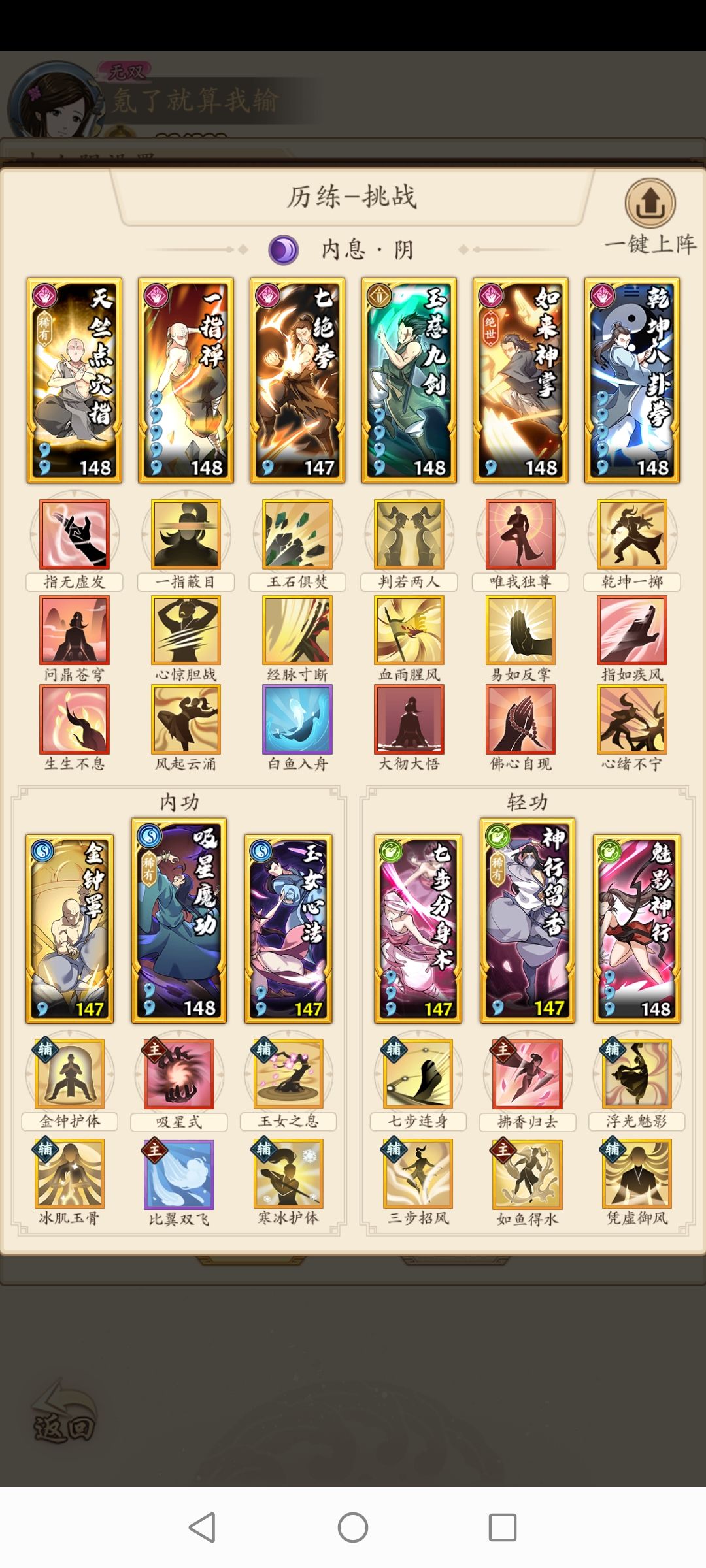 目前进度569层,还没有黑科技,趁着武学调整之前发个攻略,以此激励大家奋力推塔。 1、这个阵容一套就可以,如果推调和就切换成阴内息,阳系和阴系就直接用改阵容推塔就可以。 关于招式说明: 2、我现在游戏进度是已经开了锦衣卫,兑换了卸甲休兵;如果进度更早没有卸甲休兵,可以用易如反掌或者白鹤亮翅代替 3、要是游戏进度更慢的,没有飞沙走石和卸甲休兵,可以将如来神掌和乱花百变手交换位置,如来神掌带易如反掌和