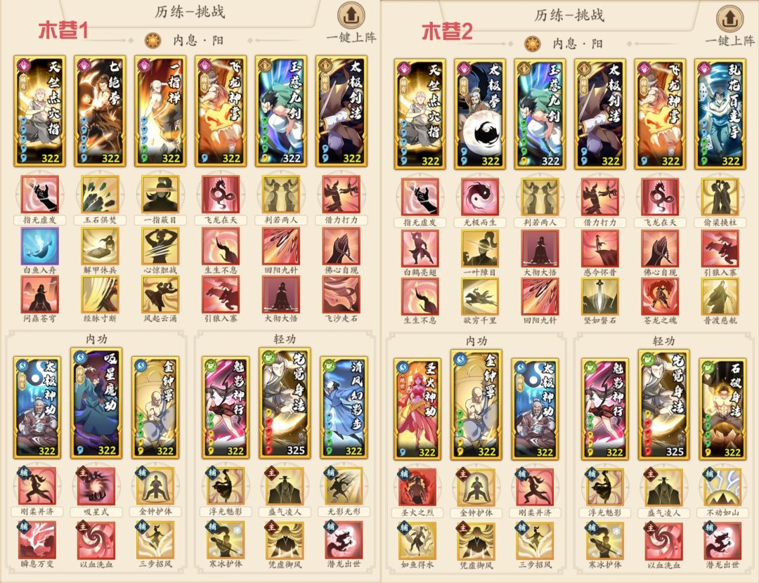 一、木人巷 木塔双雄(图一),单太极吸干,双太极打死(主韦家),换着来。木塔核心就是简单粗暴多凹,偶尔调顺序(反正我不调)。 二、噩梦巷 1.套路,开始我想弄6组3件套,便于应对30层以上的塔层。但实际爬塔就两种情况——要么碾压,要么每一层都要重新调,并不像木塔一劳永逸。因此,就列举噩梦4套模板相互配合,基本满足需求。噩梦1吸内套三系切换,基本不用动;噩梦2调和剑奇可以改成阴剑拳;噩梦3阴奇可以改