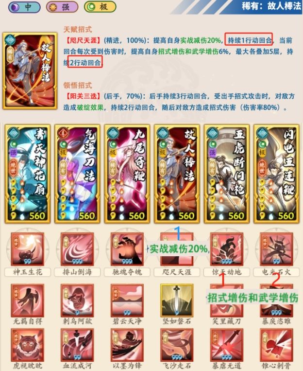 丐高人,很高兴总镖头给了测试资格,在测试服里主要测试了跟奇门有关的武学和奇门可能蹭到的招式,现分享测试情况,具体以正式服上线为准。 一看就懂的招式就不介绍了,下面主要讲讲故人棍法、游哉棍和绝世领悟招式虎视眈眈。 一、故人棍法 精进武学天赋招式:提高自身实战减伤,持续1回合,当前回合每次受到伤害时,提高自身招式增伤和武学增伤6%,最大叠加5层,持续2行动回合。 测试情况: 1、一回合时间是无法吃到d