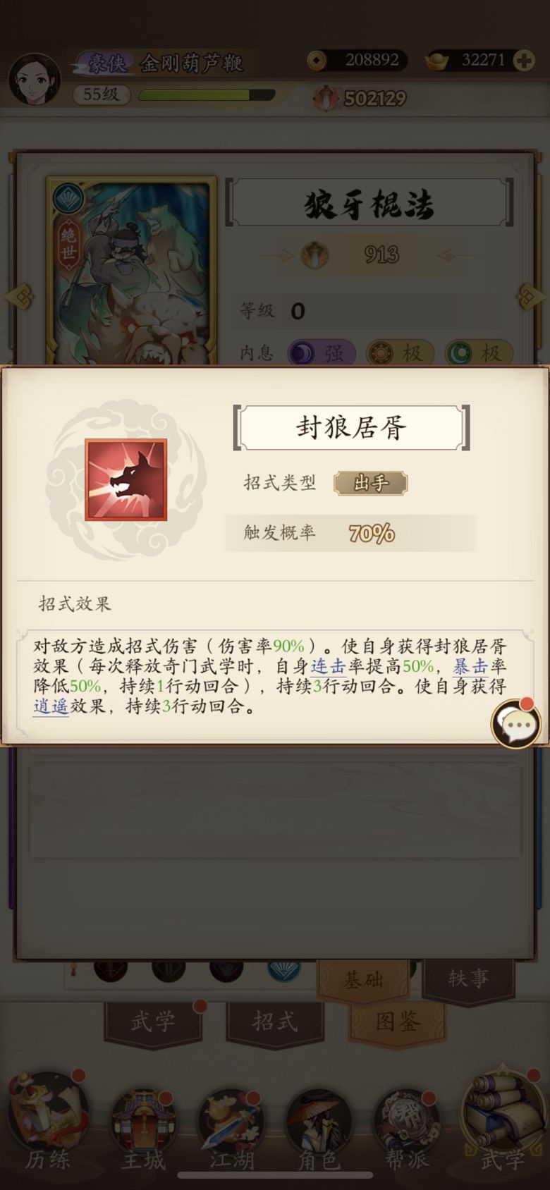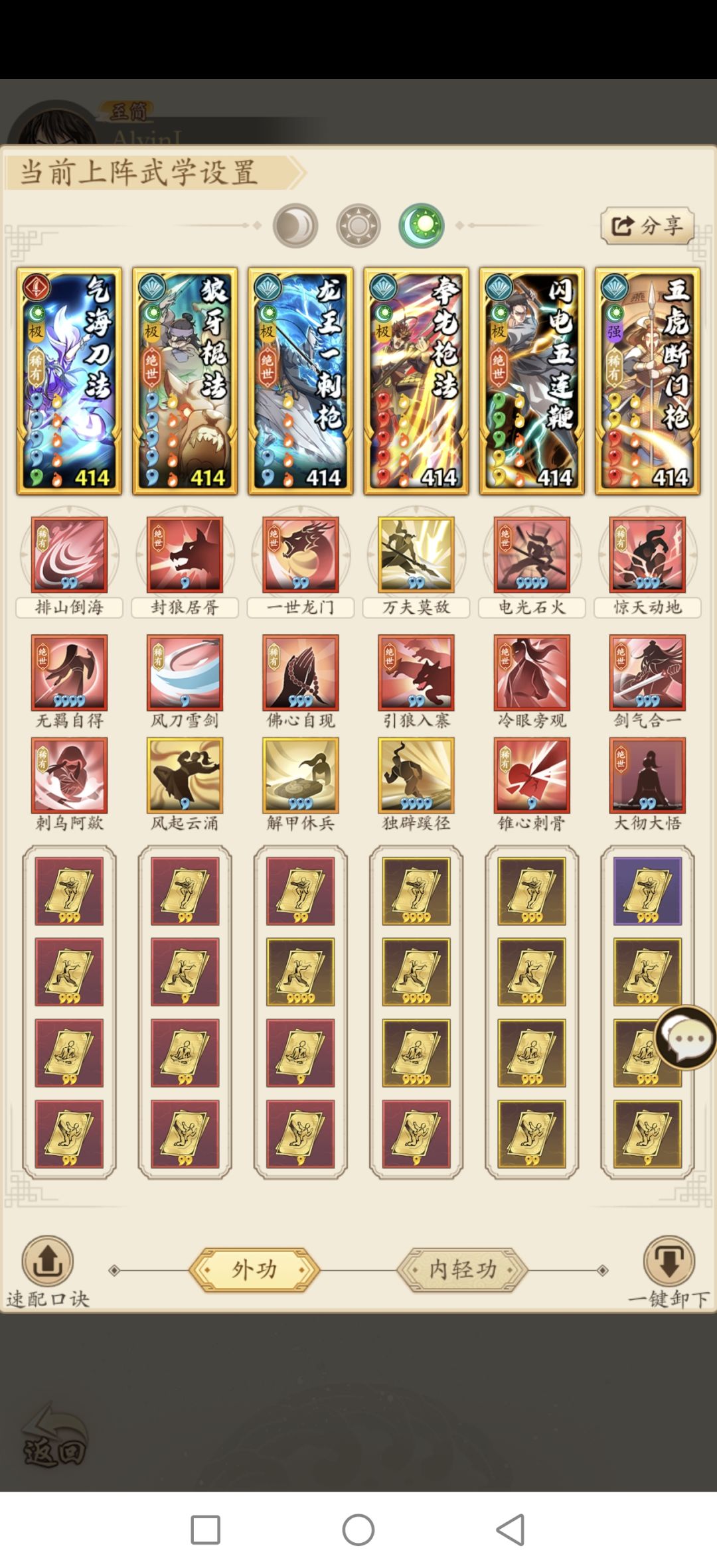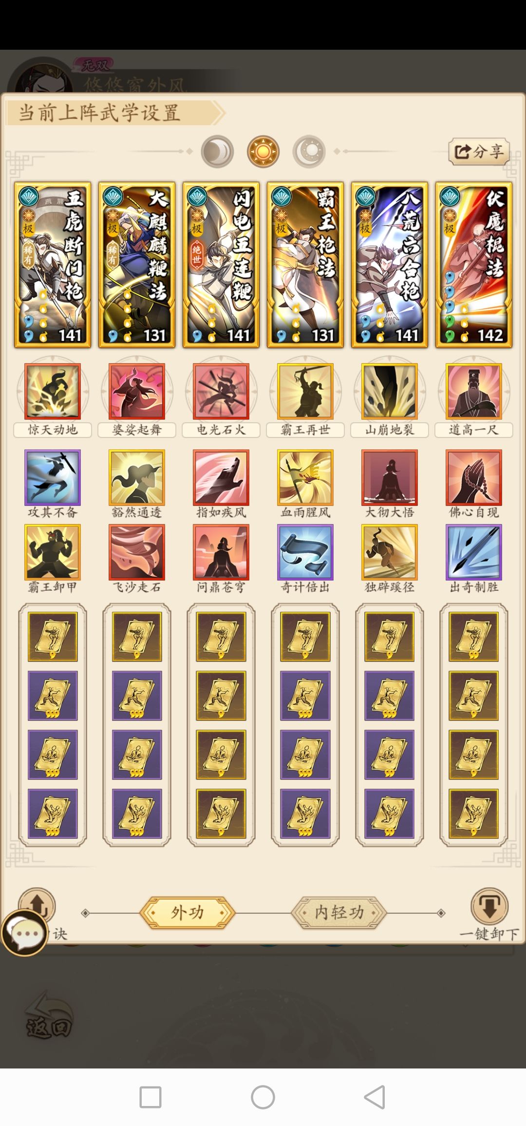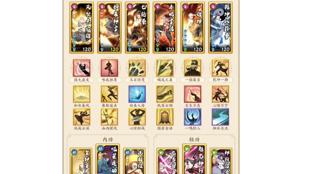 零氪阳奇门只是给奇门同门的一些些参考先上图 先谈谈思路起手五虎是参考的气海这个就不说了,二号位大麒麟如果能跳过一个关键技能也是很舒服的所以一定要带上通透加出手几率也为下个点穴加几率,三号位上了五连鞭我把这个位置当成了一个辅助位带了苍穹和点穴起一个承上启下的作用,后面的456号位就没什么好说的了基本不会有什么变化。 接下来说一下内功和轻功,内功我觉得金钟罩是个很好的保命内功让我更持久主带不败是应为