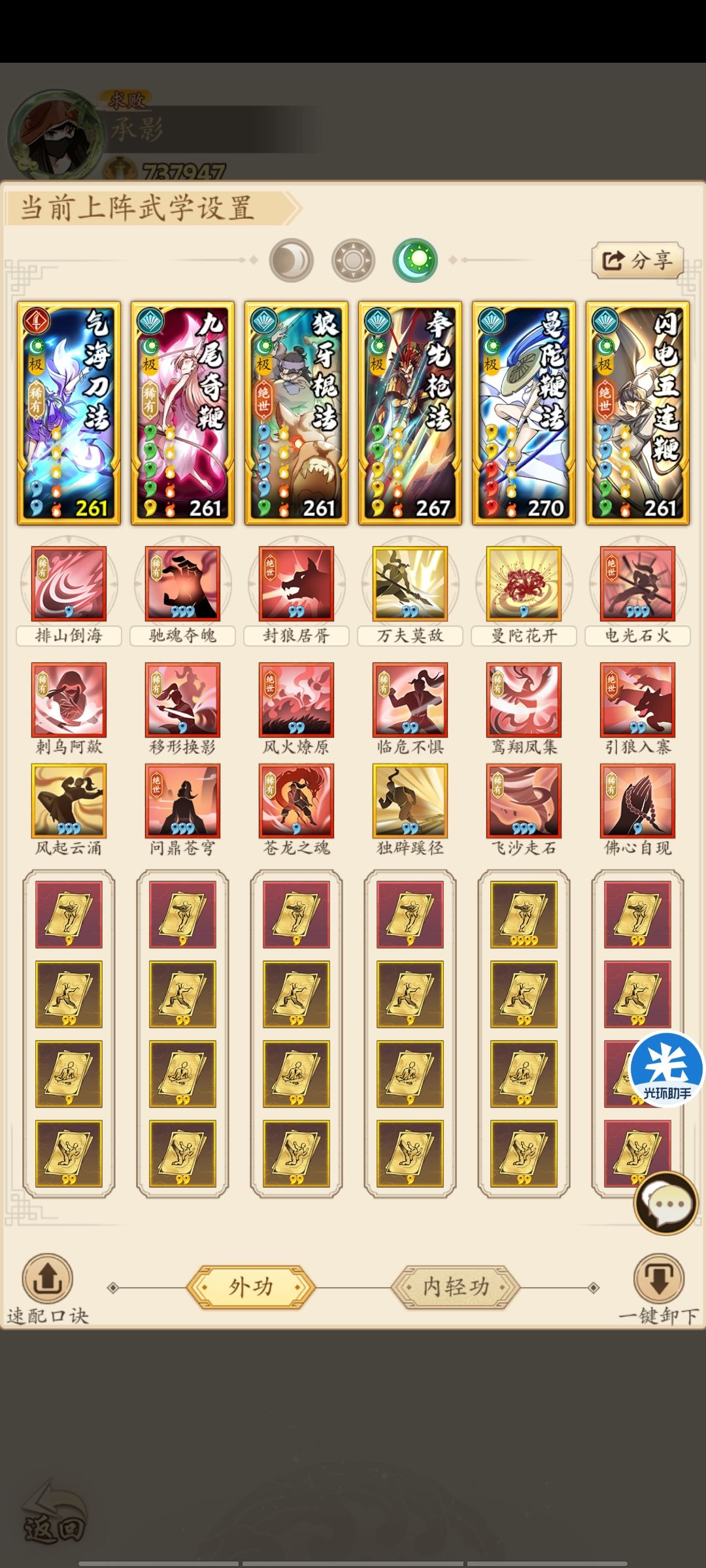 第一,我是之前是阴拳的,战力88万,现在切换奇门,装备,武学⭐最高才绿色,战力只有72万了,输出降低非常多 第二,这套阵容的缺点就是怕飞龙神掌,氪佬可以选择上个洗髓 第三,因为我是一个月卡都没冲的人,所以尽量选择普通武学为主,氪佬可以金钟换逍遥,带上逍遥的招式这样稳定20聚气,三个高调后主御风,下面有图 平民 氪佬 视频打阳刀