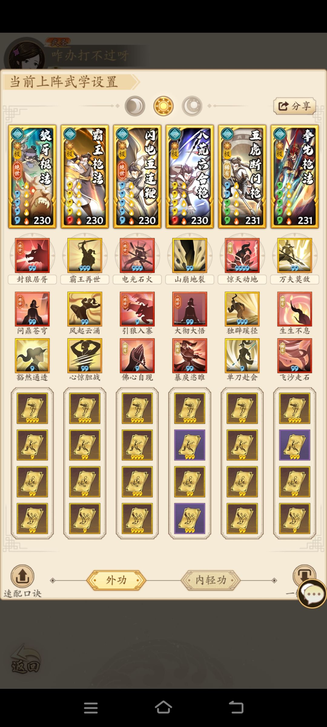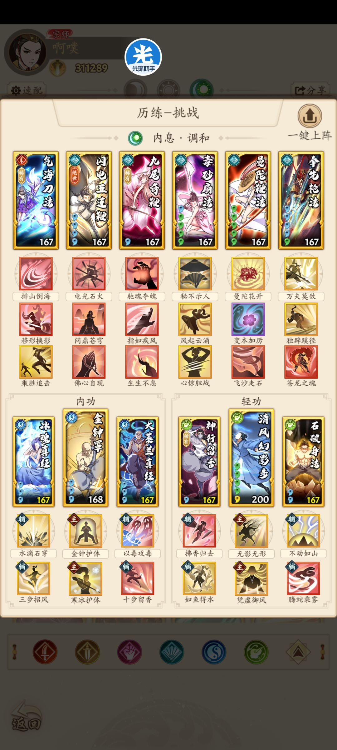 石花先落金云 冰火九蔓毒经。 每个字基本代表一本武学。 阵容受到阴拳大佬老村长金钟易筋经减伤启发,觉得好用不好用都可以给意见和用过的体验。有的大侠反映出手阴拳可以打,有说攻击不够差惊涛骇浪招式不能打阴拳 这个dot阵容里,比较重要的是金钟罩的勾玉,内功勾玉越高攻击功力越高,攻击高后手招式伤害和dot就飙得越猛,功力越高加上一功力淬峰基本拼赢同战选手,拼招一次对面减5-10%血量。 金钟罩的奥义等级