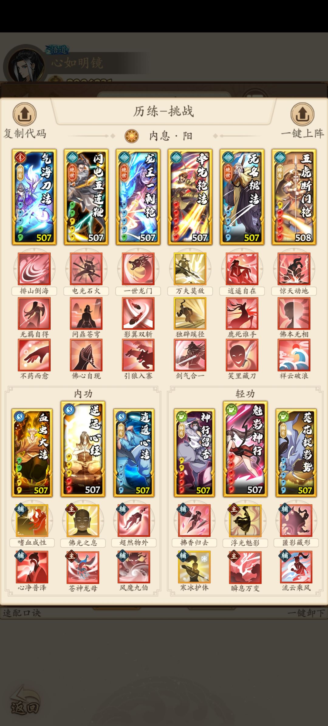 这两天在论坛上看到两个大佬的阳奇套路,不知道怎么发衔接,就是去掉伏魔棍法,主靠八荒打伤害,自己尝试了一下,再次把八荒也去掉,变成了现在这套四系混搭阳奇门。 首先说明,我在同战力中基本都是先手,选了几个战力差不多的好友切磋 都是阳内息,吸内拳居多,被调和剑天克,加上调和剑又是最多的,所以还是被人按在地上摩擦。 另外,我非常不愿意混搭,特别讨厌玉慈九剑,但是没有办法,只能加入,不过我这套拉条很快。 希