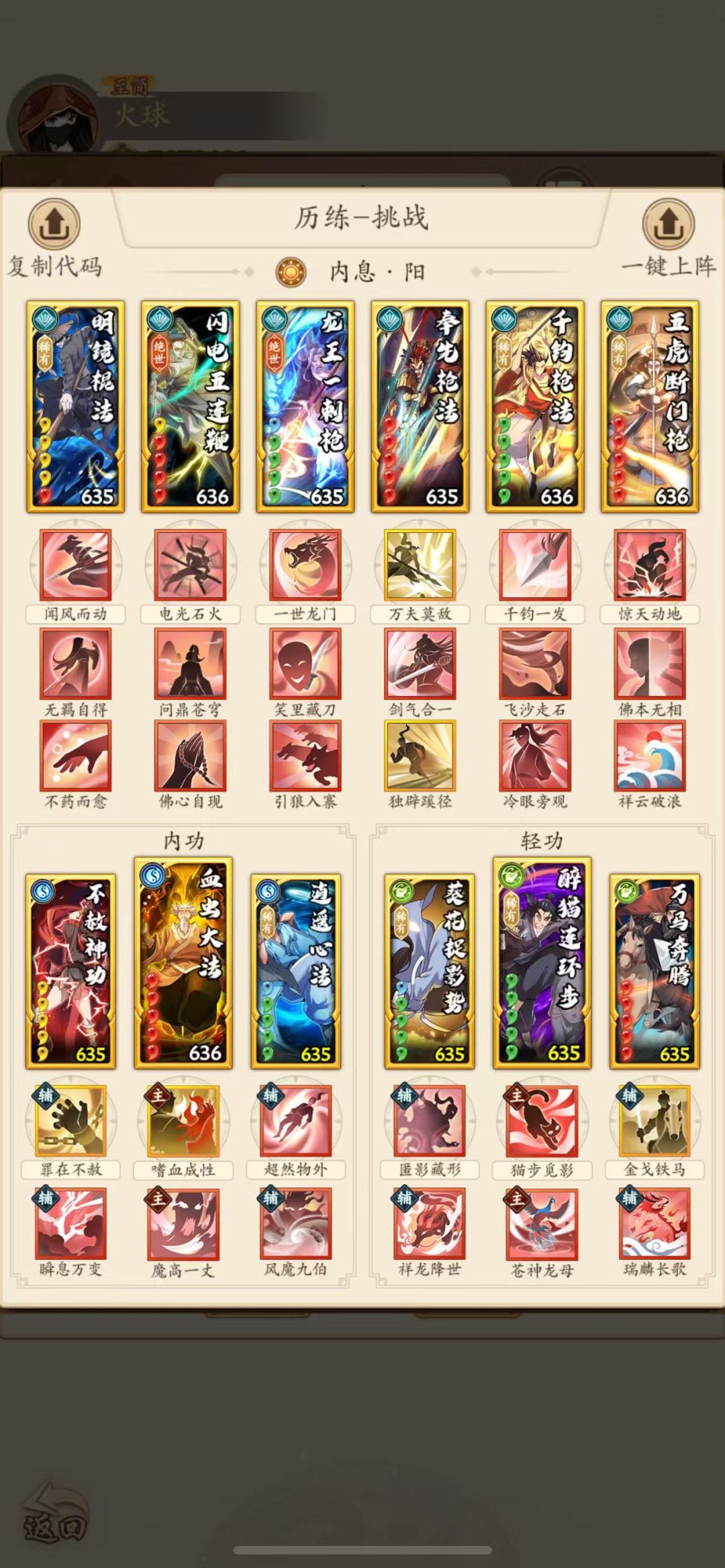 开局一本五连鞭,从此踏入阳奇玩了有大半个月了一直不觉得阳奇弱,今天武学调整后加强了一波阳奇非常开心废话不多说先上作业,再讲思路! 霸王枪法的更新没办法只能放弃气海,如鱼的削弱和霸王枪法的更新让狼牙棍法和至人无己可以加入阳奇 一号位:问鼎苍穹稳定提升连击+触发逍遥。豁然通透稳定提升封狼居胥和二号位的霸王再世/疾指如风的出手率 二号位:疾指如风点穴,风起云涌提升聚气,疾指如风可以换成心惊胆战自己取舍 三