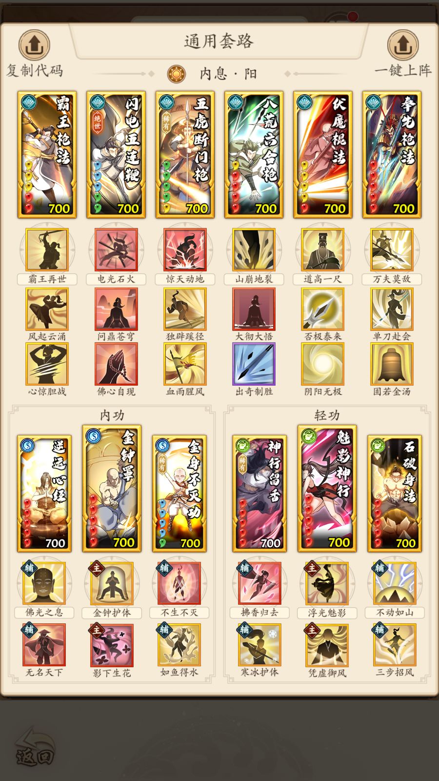 前言:闲着没事就会更,并不按照门派开启顺序更新,勿催. 1.武当进度(先手续航阳奇) 前期胜率主要来自于先手,新手玩家要做的就是狠狠的卷聚气就可以了,先手赢一半 淬锋:5聚气2四系1功力 注解:微调方向 1.临危不惧可换心惊胆战 2.触目惊心/单刀 可换刺乌 3.莫失莫忘/三步招风 可换如鱼得水/无名天下 4.如无先手-金身不灭功可换云体增加解控概率 2.武当进度(后手爆发阳奇) 淬锋-4四系3聚