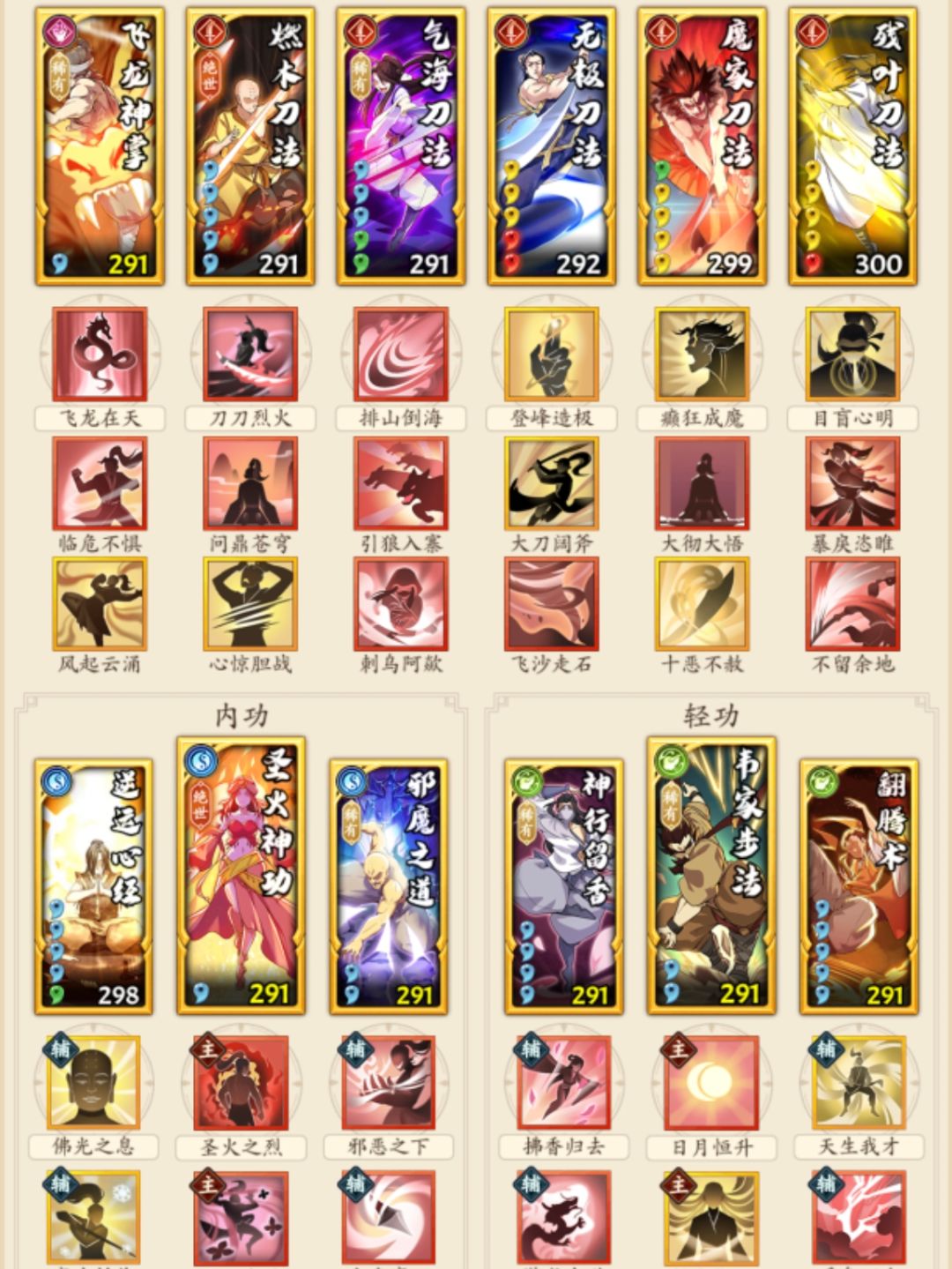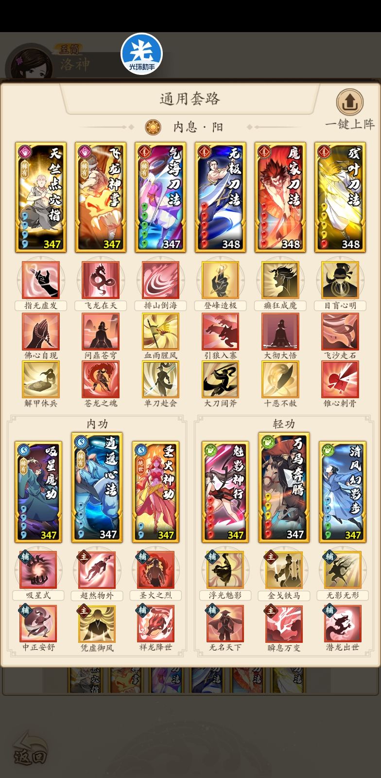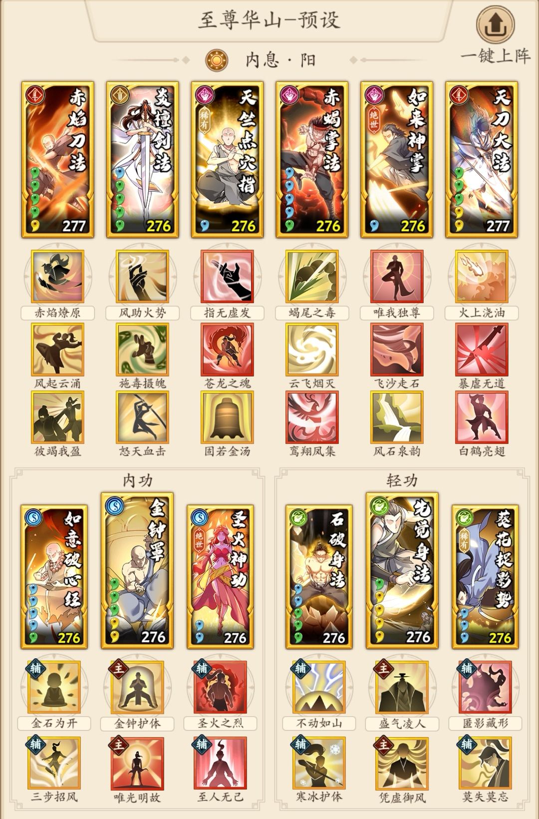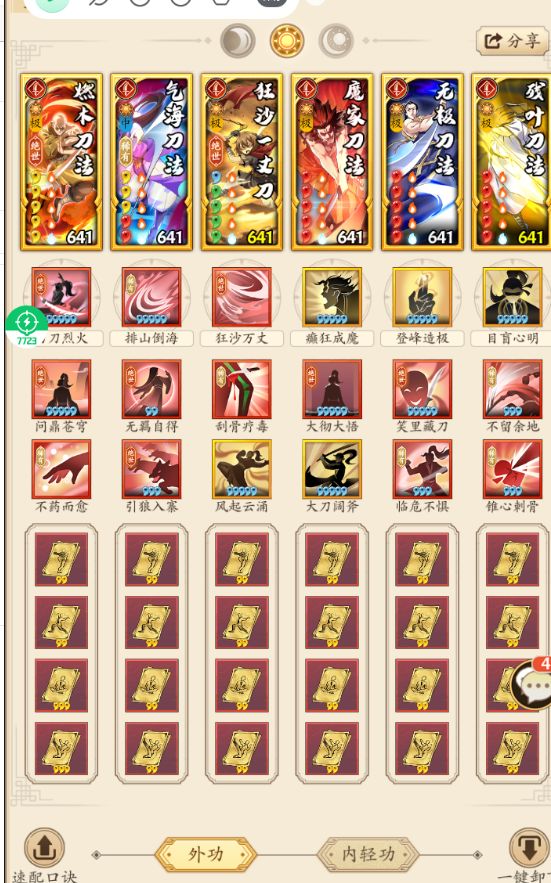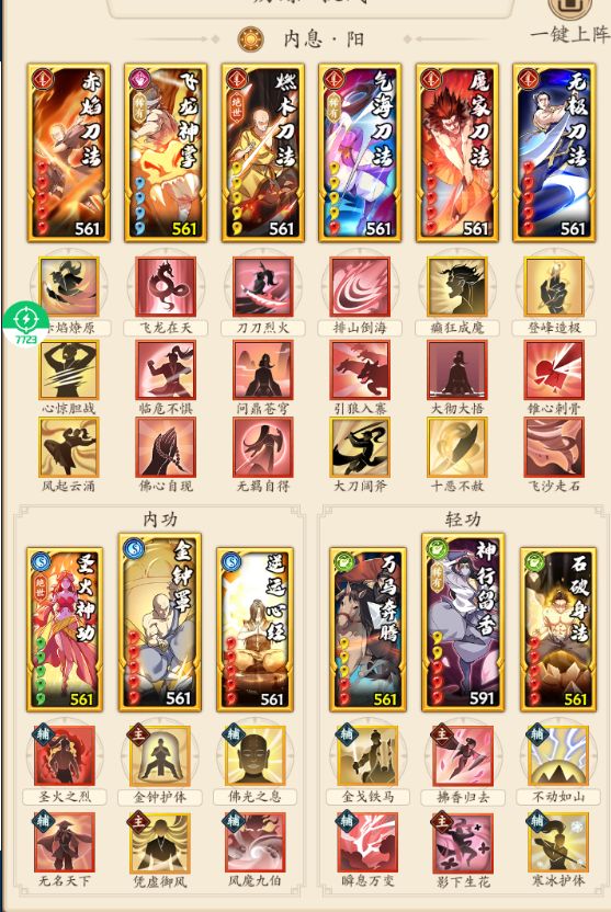 门派进度到云浮,招式不全。花了不少时间配了一套至尊华山的套路,目前强度不错。就缺点而言,目前就发现调和这套稀有绝世绝学比较多,上阵战力比较低。 目前招式也不算,我也只是新手组选手,各位大佬就看个大概思路,有问题也请指正。 更新了调和的一个招式,顺便写下配招思路。 总体情况,我现在总战是336万,最强一套75万光明刀,对应上面三套:光明刀72万,四板斧74万,调和刀65万。按照我最强配招强度是100