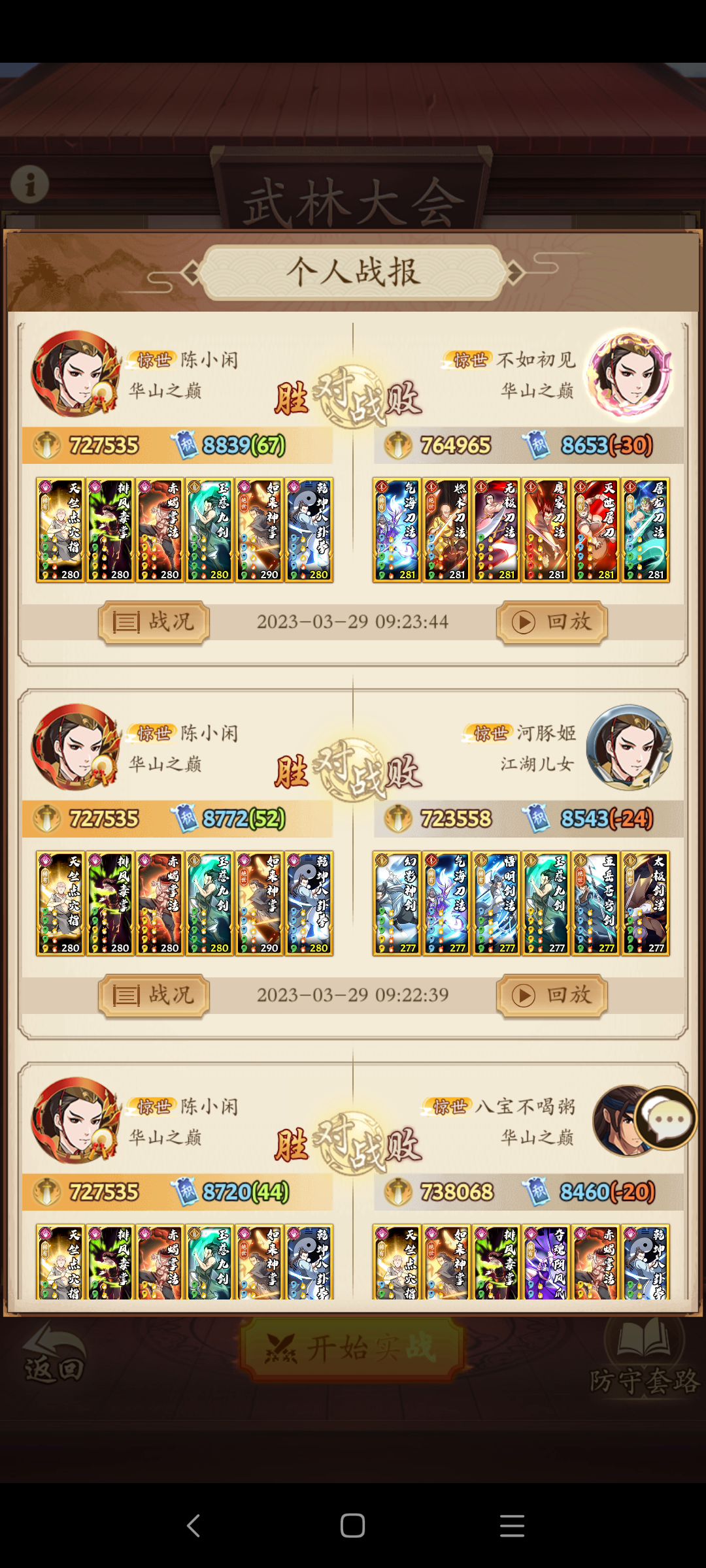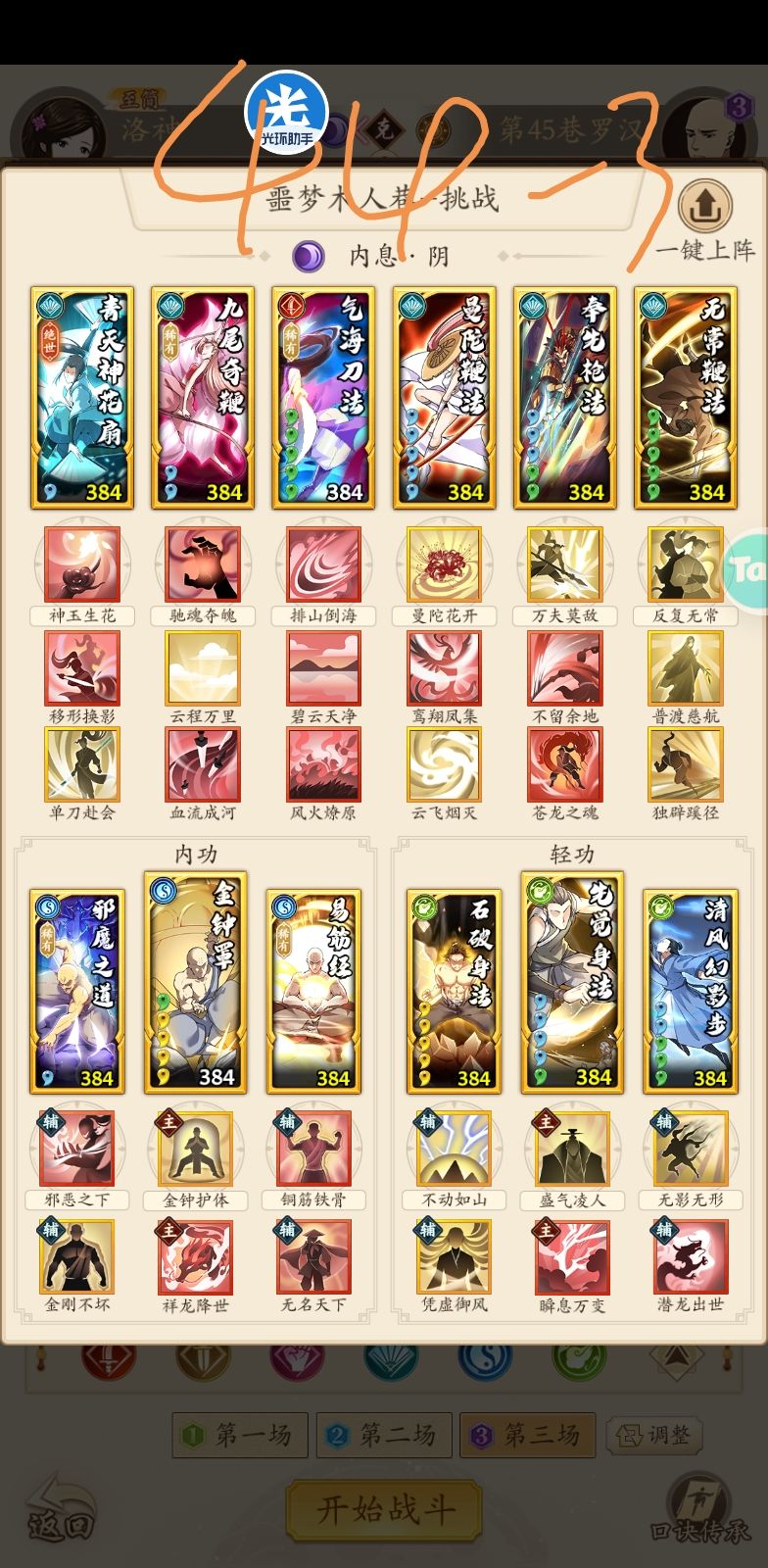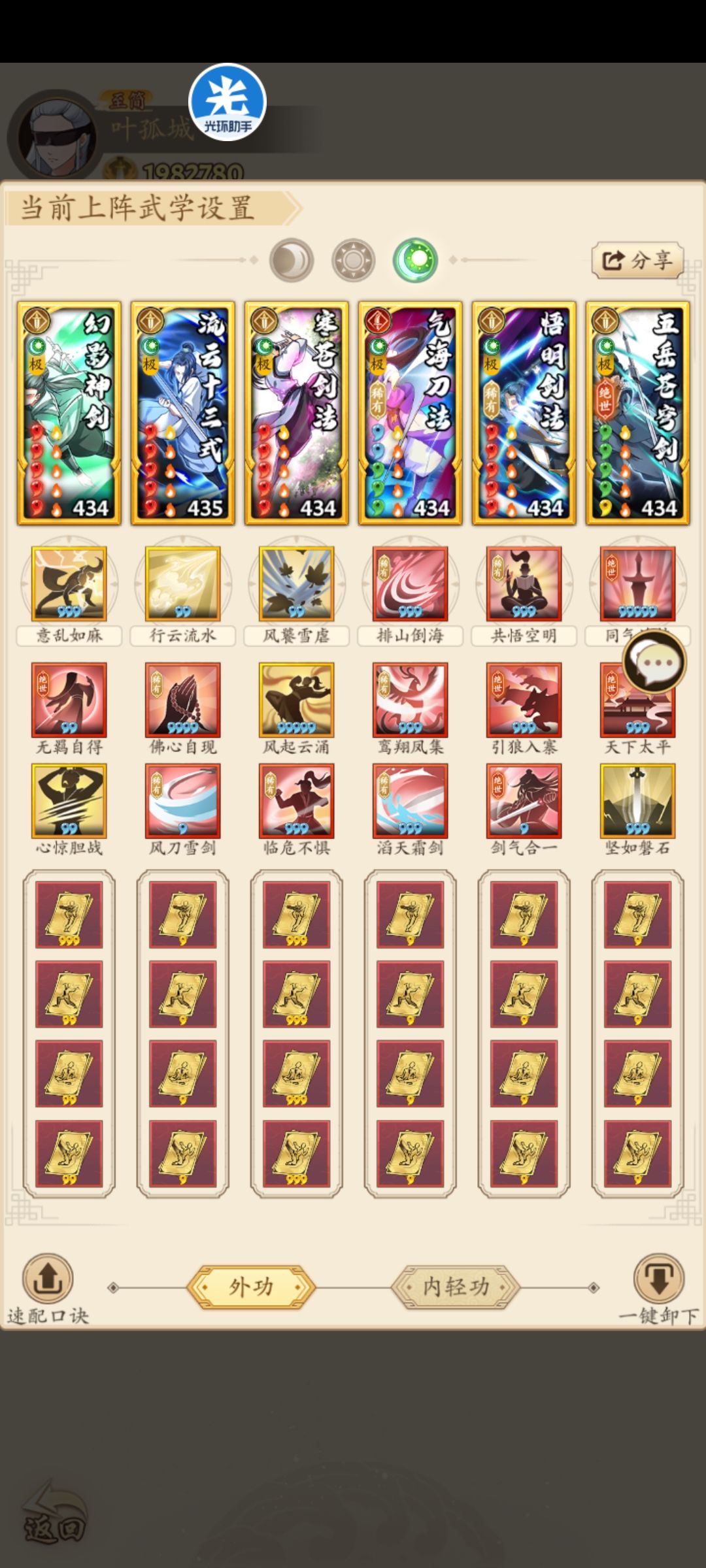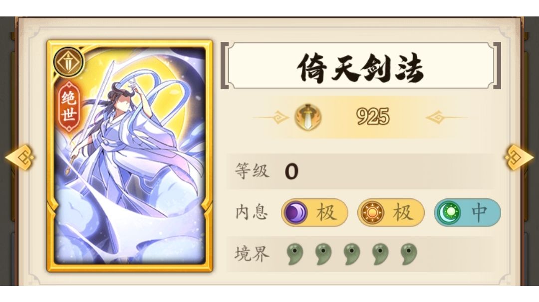 门派进度到云浮,招式不全。花了不少时间配了一套至尊华山的套路,目前强度不错。就缺点而言,目前就发现调和这套稀有绝世绝学比较多,上阵战力比较低。 目前招式也不算,我也只是新手组选手,各位大佬就看个大概思路,有问题也请指正。 更新了调和的一个招式,顺便写下配招思路。 总体情况,我现在总战是336万,最强一套75万光明刀,对应上面三套:光明刀72万,四板斧74万,调和刀65万。按照我最强配招强度是100