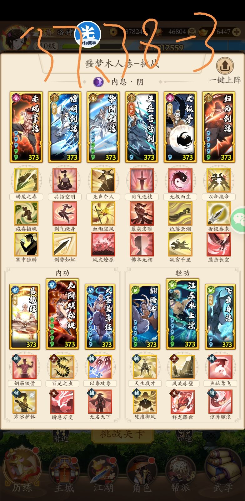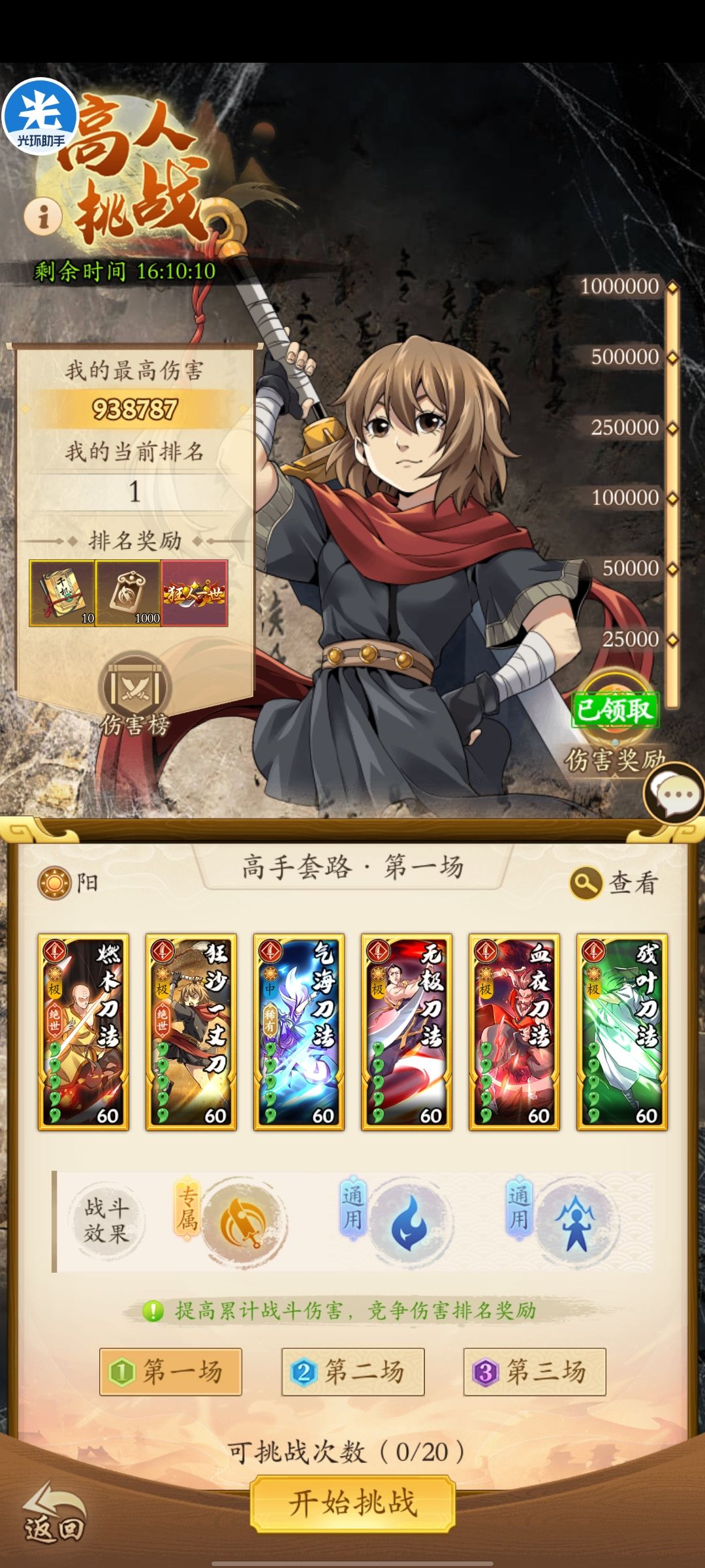 论坛的阳刀高人挑战攻略实在太少,自己组了组,打了93万,在此抛砖引玉了。 第一套调和剑和第三套阴毒都是论坛抄的,感谢大佬们分享,第二套就是常规阳刀转阴息,带玉女和吸星,我这勾目前最高能打68万左右,没次数了没法试了。