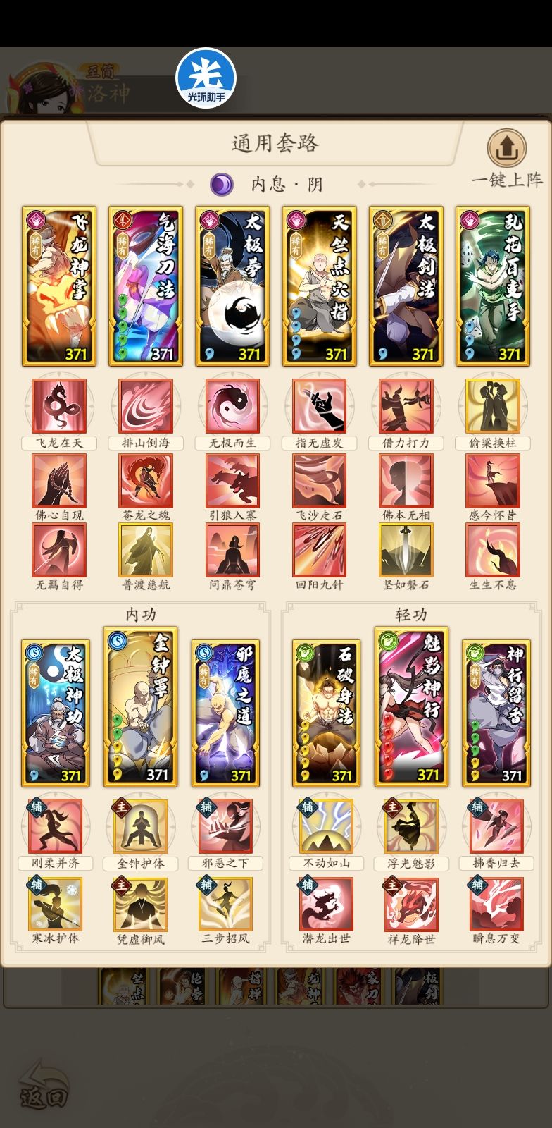 有万马后,刀连击高了一点。祥龙用来爬塔那是神器,必须上。这个现在可以爬到1360层。调和息和尚用阴内息套路打,阳息和阴息用阳内息套路打。