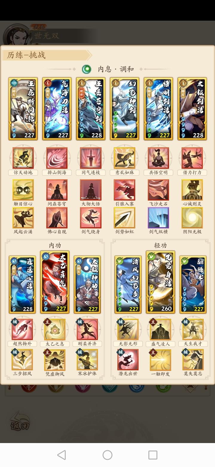 保卫成都活动后的阳剑(主要是因为圣火勾低不好放主位,我就试验了一下用不赦神功来替代圣火的),打木人换太极,如果有瞬息万变就可以不上苍龙神母,改上影下,目前心惊控制对阳剑影响还是挺大的,怕点穴就主神行,我套路里上的都是勾高的,听说涅槃下版本要增强就带上了