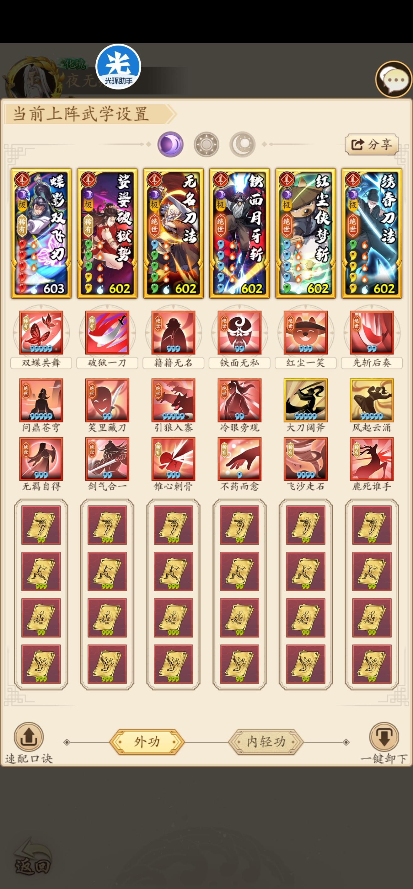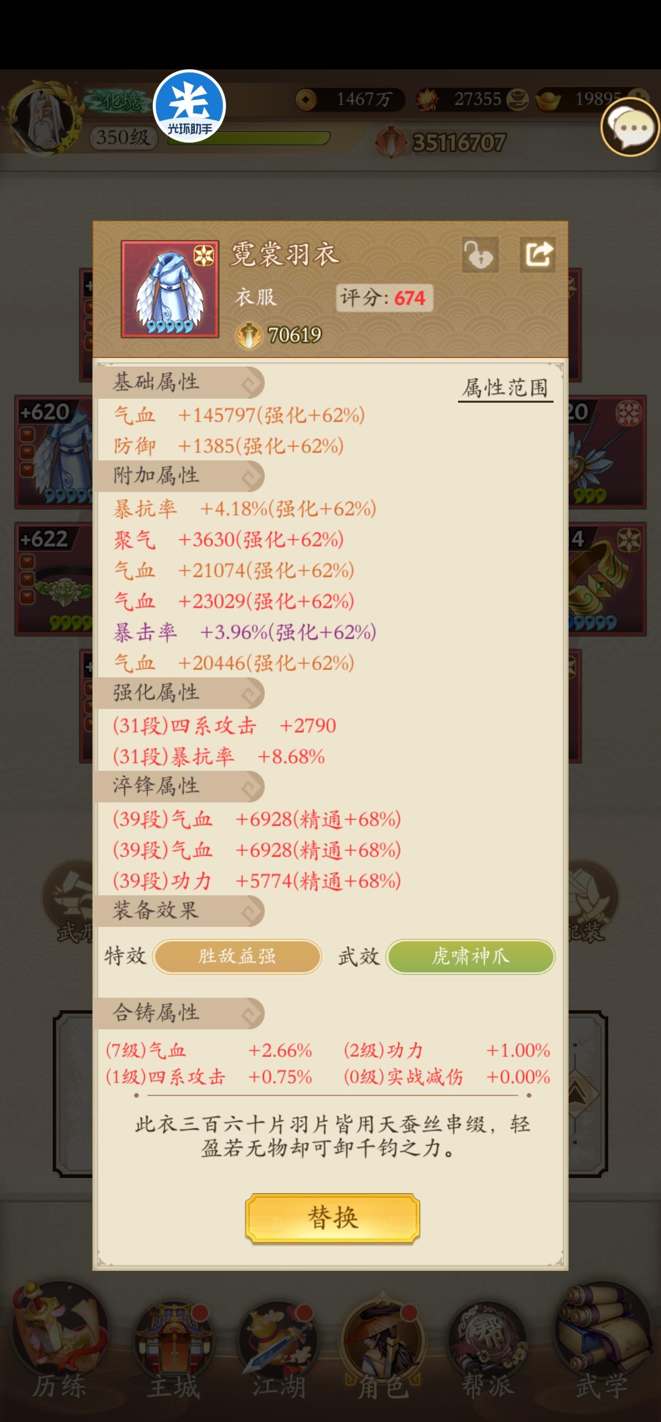刚开丐帮,330抽二狼牙三飞龙。又多抽了点花1万贡献买了本逍遥。目前心愿只考虑稀有亮了再抽,心愿从先觉换成了清风,稀有还是悟明,绝世之前是抽第2个游龙,等亮了接着抽5岳目前配阵cEc+wmJH03I38q3Qb51N2uAa4G2cH74k5Bd83l4hh98u3hO33CG79cs93Wk63dh24jn26t # # 复制本代码,在游戏中-布阵导入