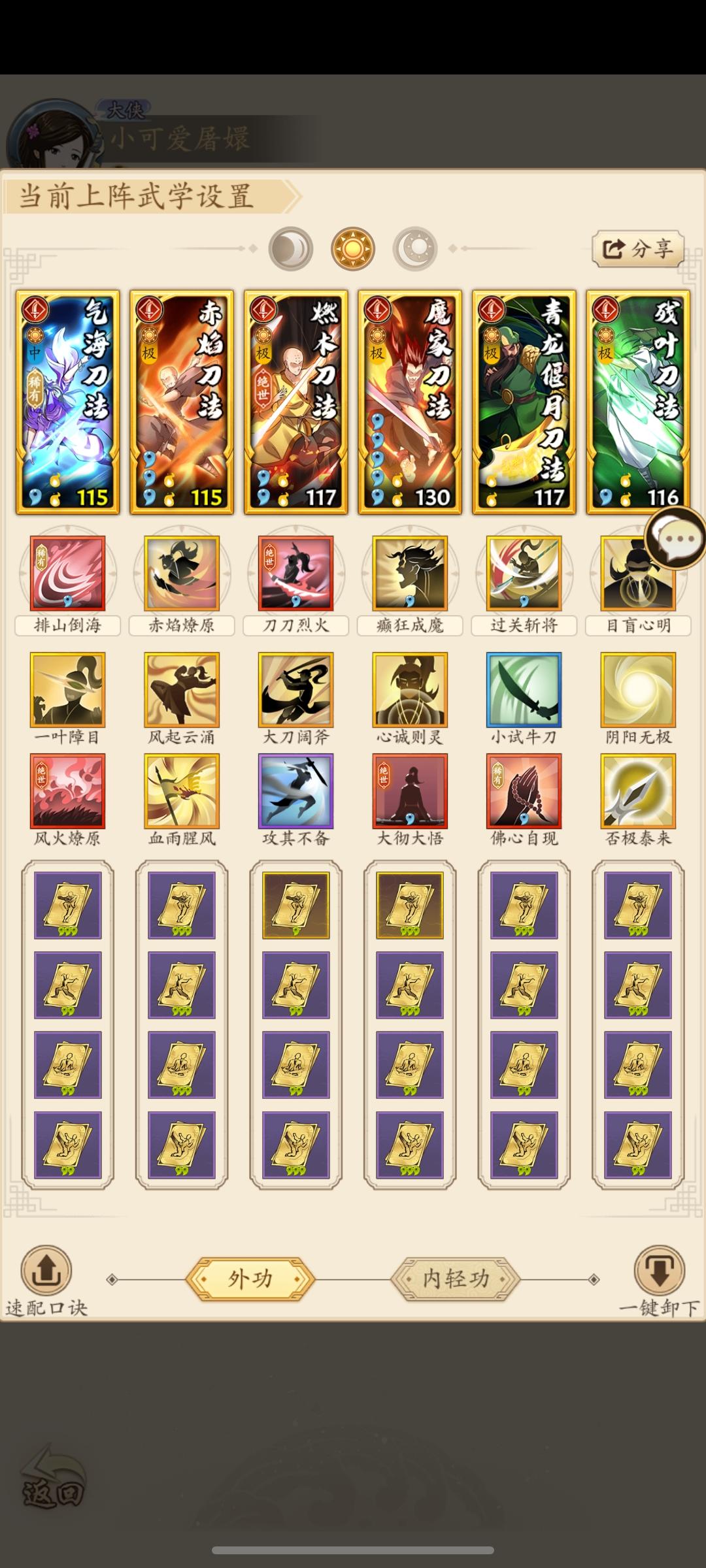 哈喽宝子们,卖掉阳刀已经有2个月了,现在也是好起来了玩上游龙调和刀了,游起来!总结下来两个月的体验还是不错滴,尤其在参考调和奇老祖秋风的盾奇基础上进行优化调整后更好玩了,下面分享下近期在玩主流套路淬炼:4攻击3聚气1功力装备:兵来,得心应手等,我都没也在玩优势:在没有办法游起来的时候,这套强度在线的同时成型快优化:如果区里4系比较厉害的话 可以上淡泊明志,主一个三步招风后手拿警惕cEc+