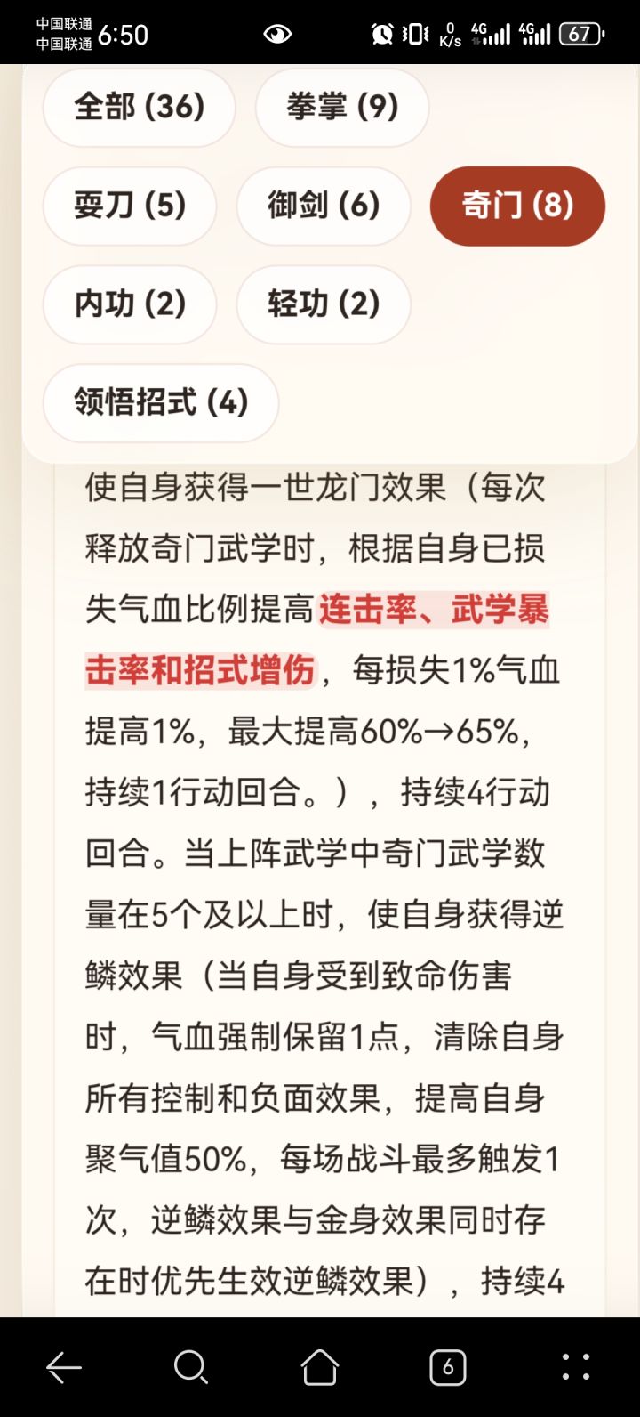 第一个武学 相由心生,只要对方有盾20%实战增伤1回合,上限3回合20%实增.(改的真好刀刀人专克)第二个武学蛇影拳。直接获得了48%概率成功的两回合寒毒,(改的真好就应该让拳可以无条件针对龙王)第三个武学 锦绣千机又是无条件的在原有机制上增加了新机制随机控制,相当于直接把无常鞭法加强后拓印上去了,并且下限也是直接增加了不需要护盾就可以解控。第四个武学 虎头猫爪对纯拳系无影响。顶端的
