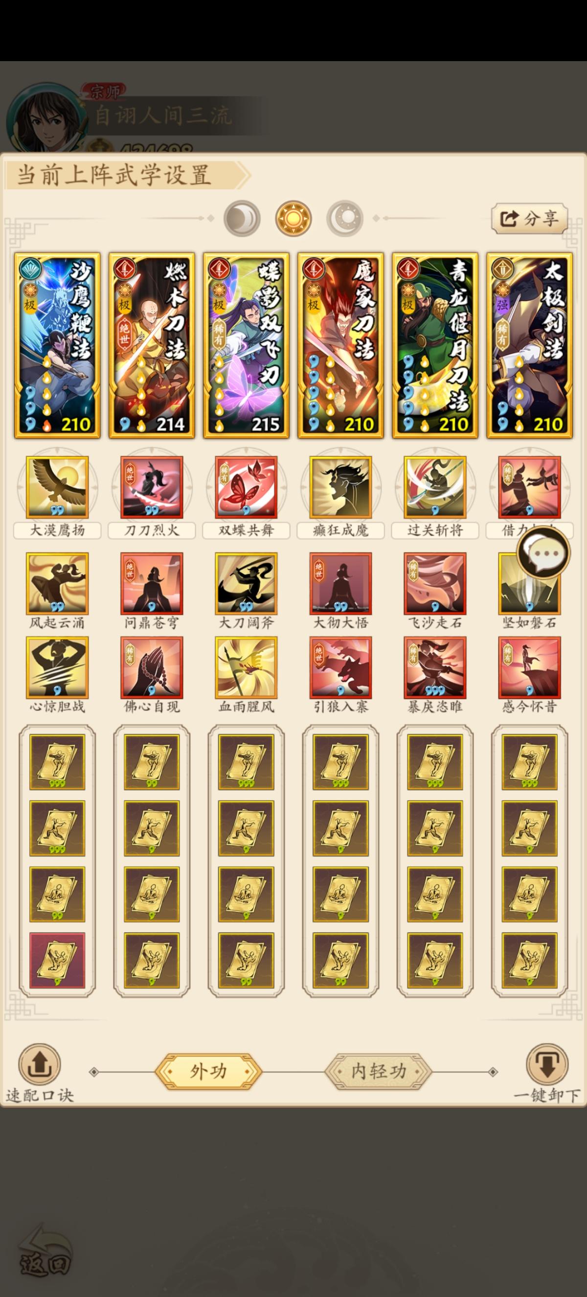 我是小乞丐,一个阳刀玩腻了准备玩阴刀的萌新,由于我大号养成歪脖子树了,而且也玩了两个多月了,感觉有些自己的理解了,于是开了个小号玩阴刀,阴刀前期确实牢,但是感觉上在锦衣卫开始有所好转,仅仅好转那么一点点而已,目前刚开波斯,第三套是我目前在用的,算是半个阴剑,金钟加石破防阳刀阳奇这类暴击伤害的,如果没有卷帘西风可以换寂灭刀法的招式,常山剑法主要是给寂灭刀上后手增伤的,而且还可以回春续航,图中大多出手