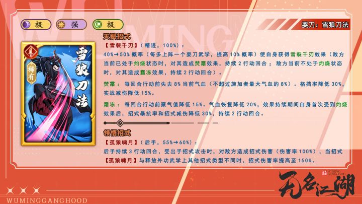这两天,妞妞在打探消息时,竟意外挖到了一条关于新武学的情报—— 想必大伙早有耳闻,咱们《无名江湖》短剧已于去年正式开拍啦! 而来自《无名江湖》短剧中的角色,他们所使用的武学,即将在游戏中通过春节活动登场。(悄悄透露一句:短剧也将在近期,与少侠们正式见面~) 话不多说,新武学情报直接奉上:>>>稀有刀法【雪狼刀法】武学效果:>>>稀有御剑【无问剑法】武学效果:>>>稀有拳掌【赤炼拳