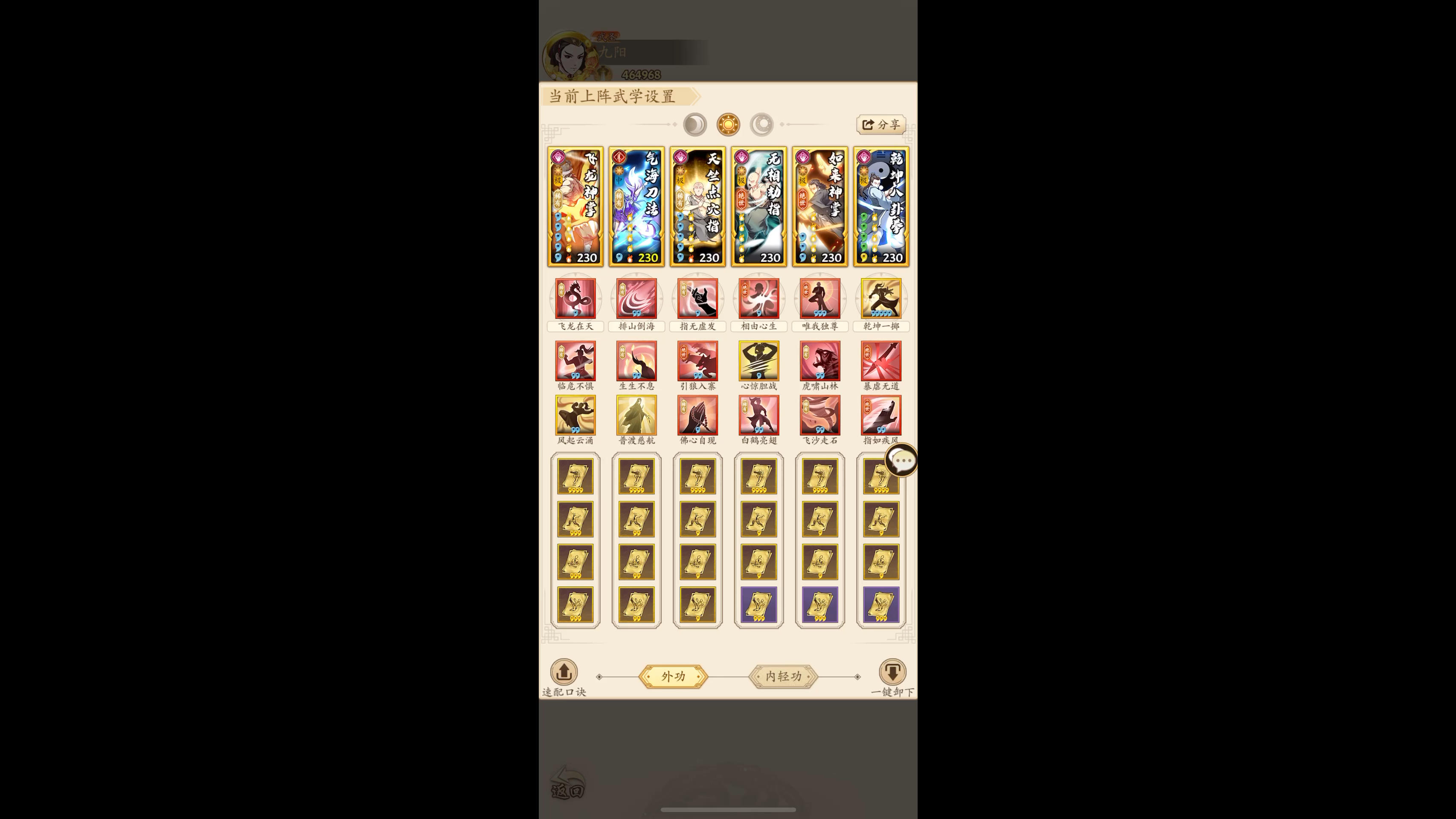 利用飞龙打出麻痹,一二号位打出心惊,禁掉对方两个武学,三号位点穴后,四号位再追击心惊,对方基本全程处于有心惊状态,最后利用如来跟八卦打爆发!处于后手状态时逆推,一二号位分别控制对方二三号位,最后的八卦拳打出点穴的话立马反守为攻,逆抢先手!