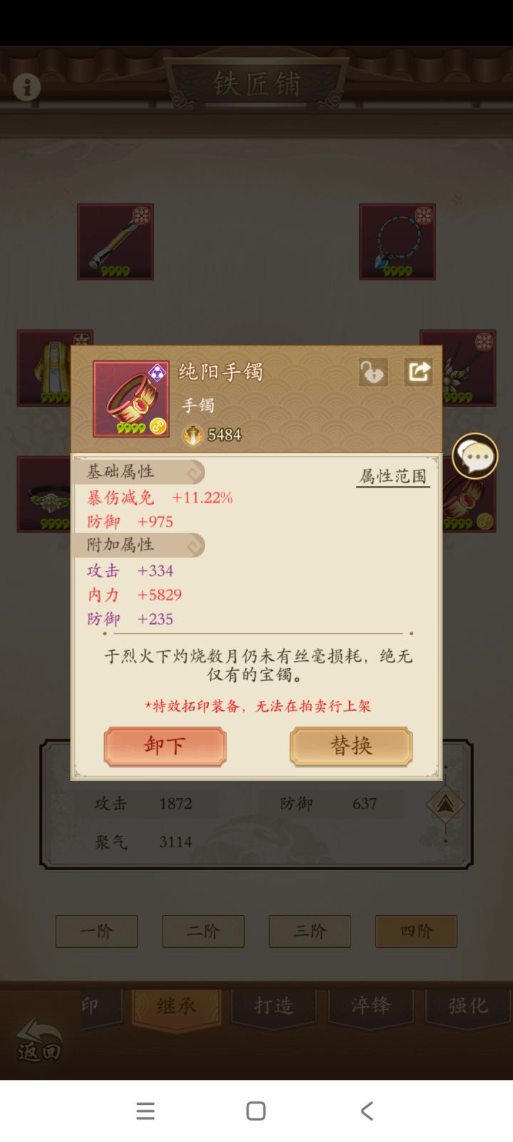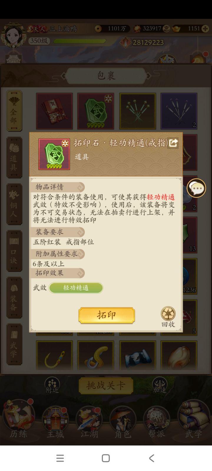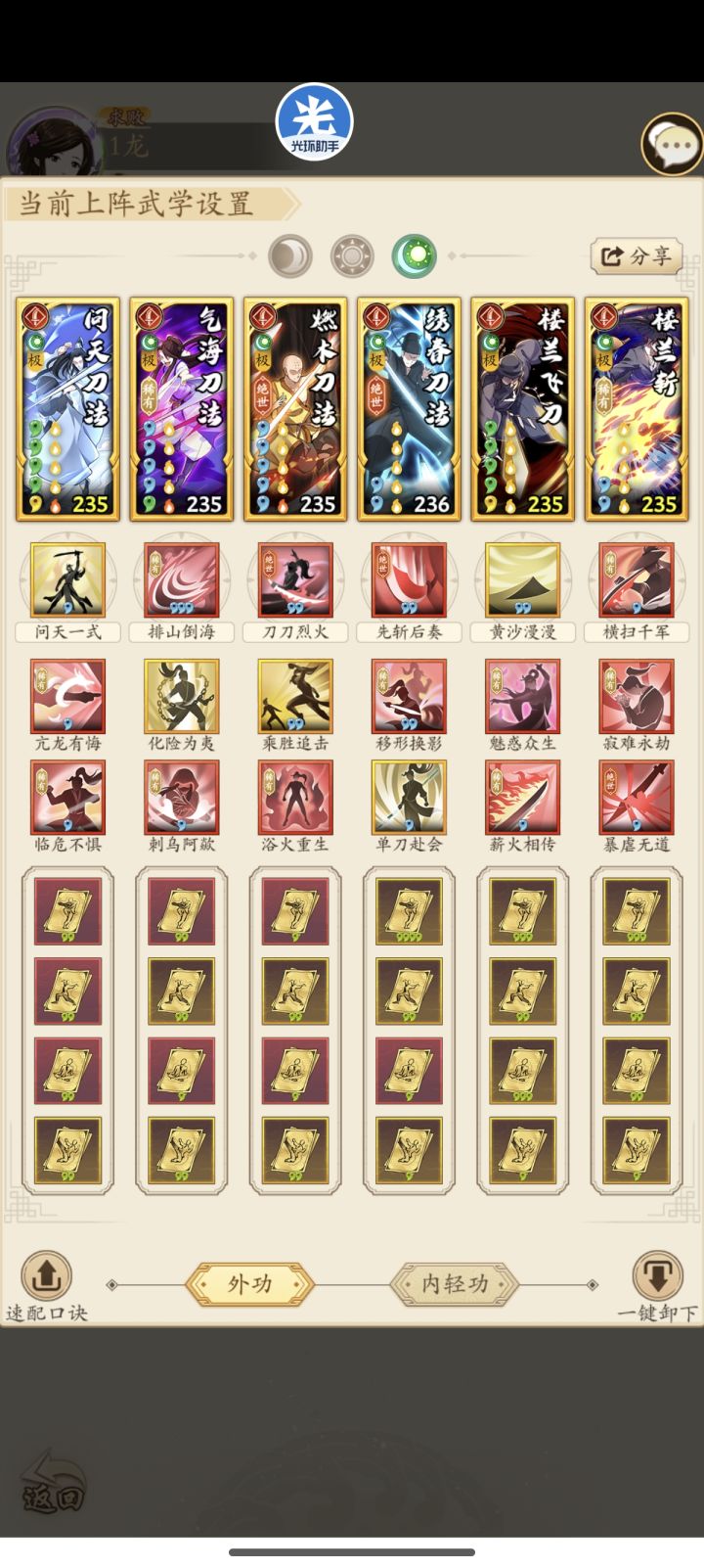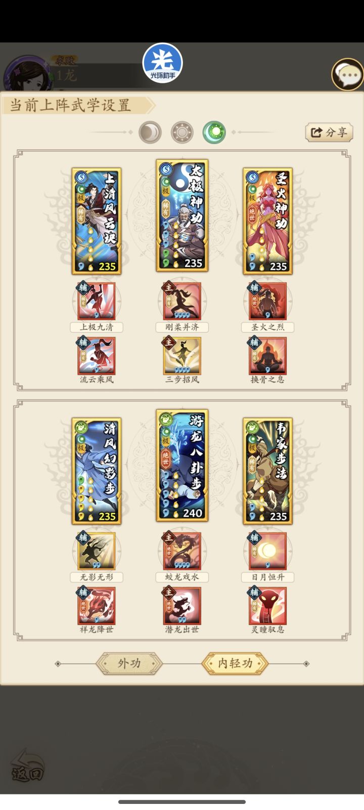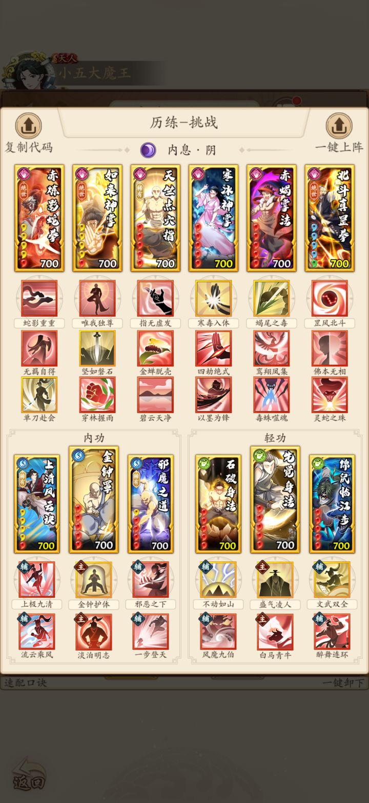一次挑战分为10场比赛,每场比赛前玩家都可以从武学库搭配组合自己的套路,进入比赛。