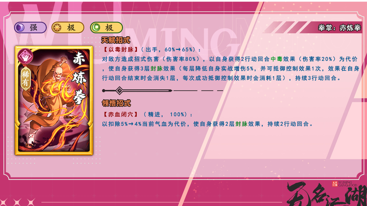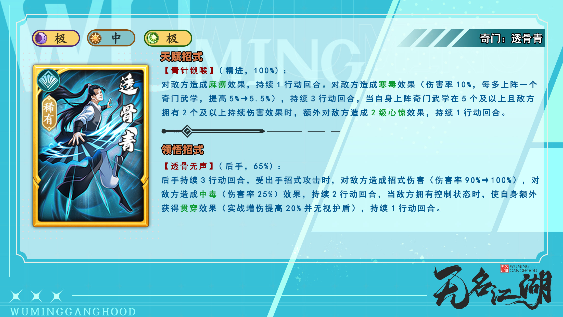 这两天,妞妞在打探消息时,竟意外挖到了一条关于新武学的情报—— 想必大伙早有耳闻,咱们《无名江湖》短剧已于去年正式开拍啦! 而来自《无名江湖》短剧中的角色,他们所使用的武学,即将在游戏中通过春节活动登场。(悄悄透露一句:短剧也将在近期,与少侠们正式见面~) 话不多说,新武学情报直接奉上:>>>稀有刀法【雪狼刀法】武学效果:>>>稀有御剑【无问剑法】武学效果:>>>稀有拳掌【赤炼拳