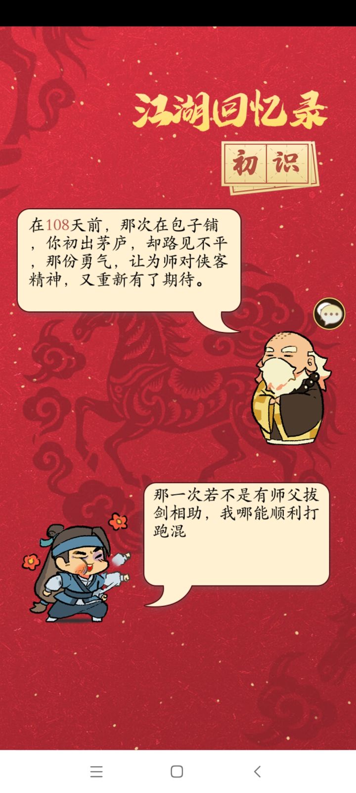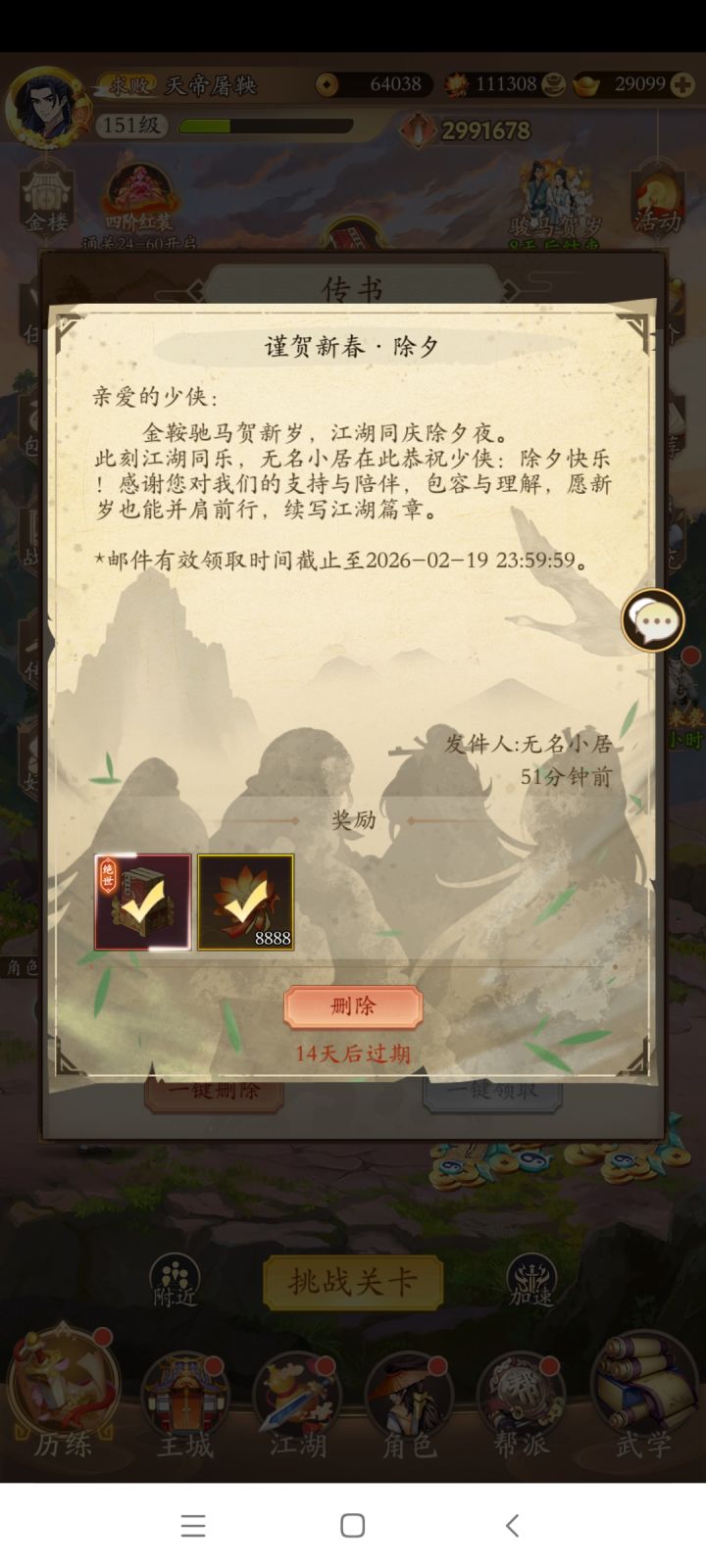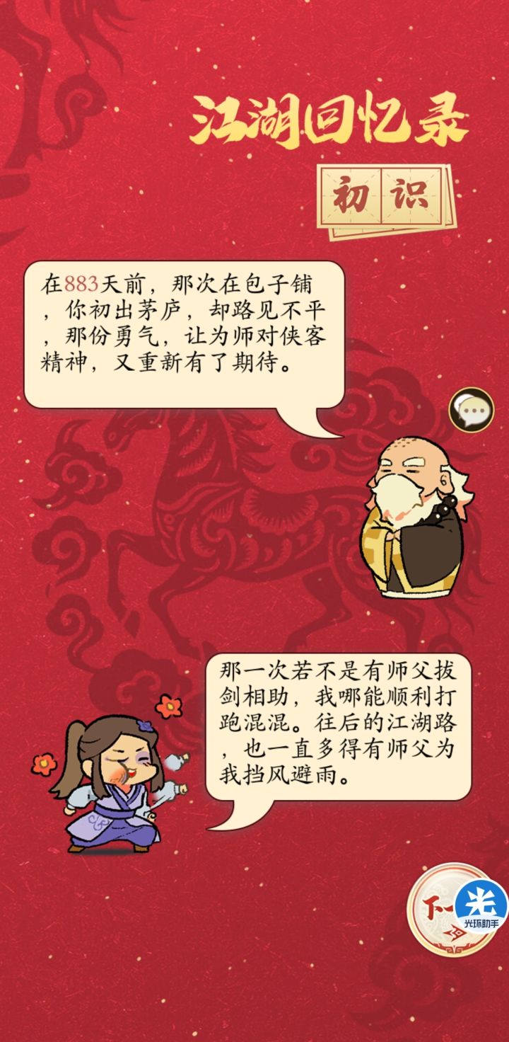 今天是除夕了,感谢在江湖一路相伴的各位好朋友,好大哥们,祝大家新年快乐,身体健康,万事如意,心想事成,发大财!来到江湖108天,我感受颇深,玩的是这个游戏,体会的是整个人生,感恩遇见的每一个人,感谢每个帮助我的人!