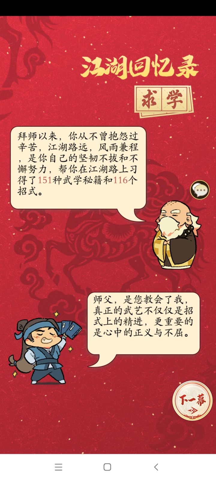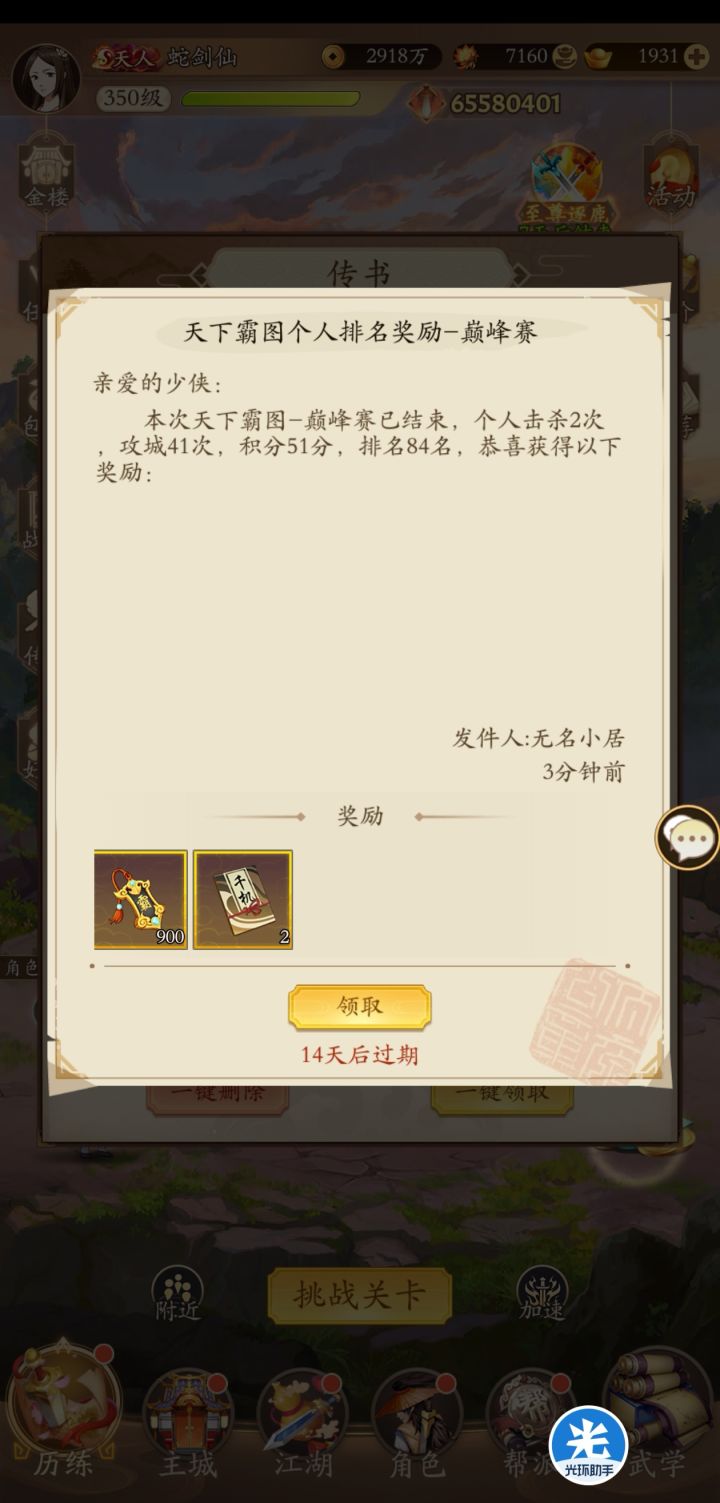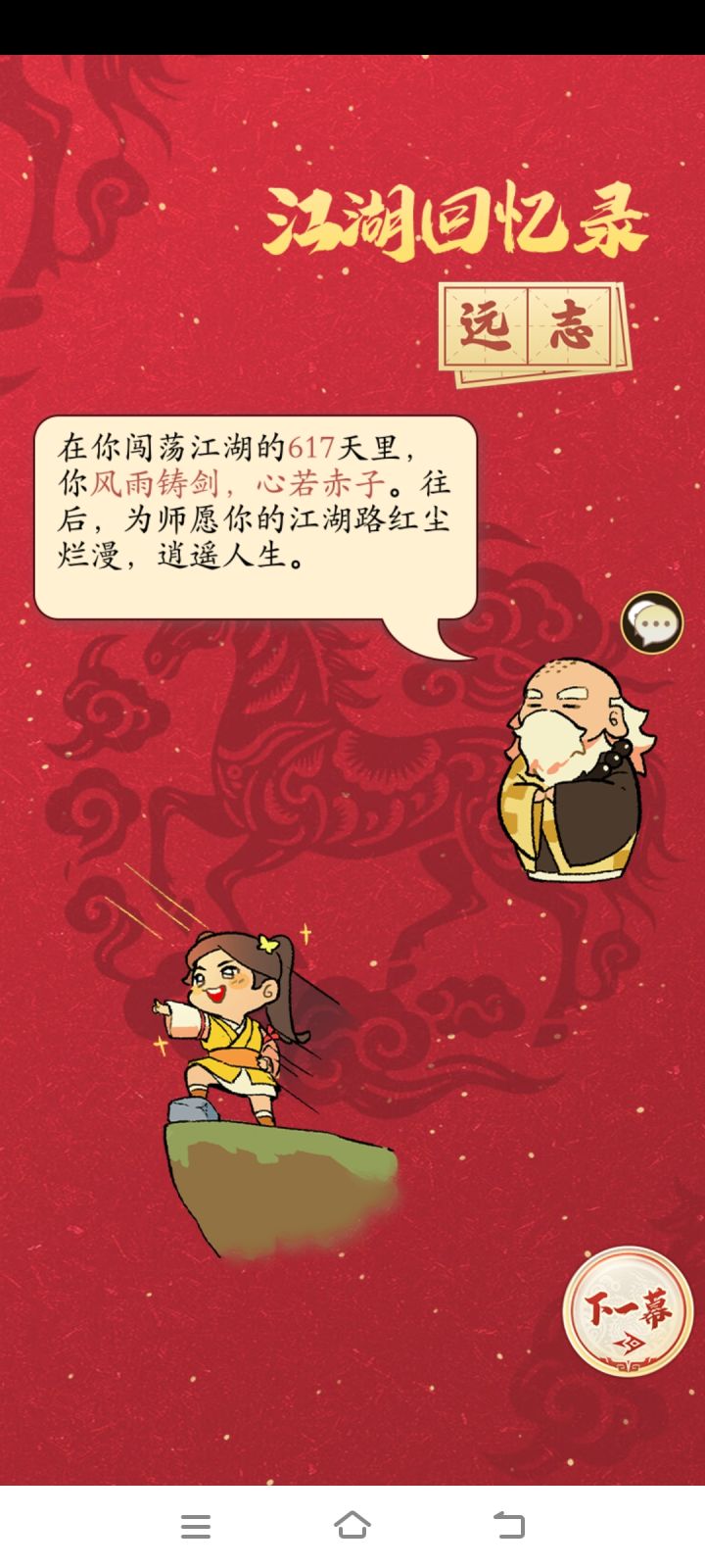 今天是除夕了,感谢在江湖一路相伴的各位好朋友,好大哥们,祝大家新年快乐,身体健康,万事如意,心想事成,发大财!来到江湖108天,我感受颇深,玩的是这个游戏,体会的是整个人生,感恩遇见的每一个人,感谢每个帮助我的人!