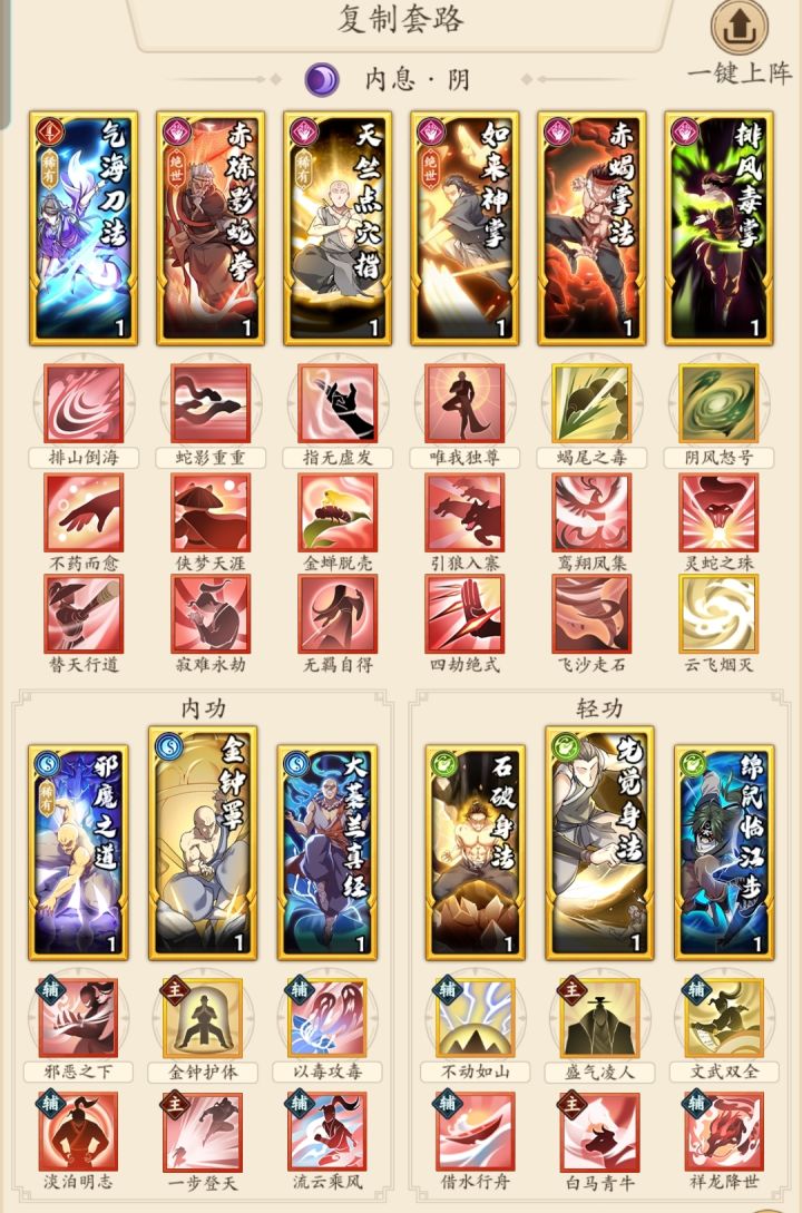 布了一个逐鹿/华山用的副队阴奇,用新气势替代先觉身法,主后手副dot。后期飞鱼身法星级高了,可以主飞鱼。新奇门武学真的不错,值得升红。
