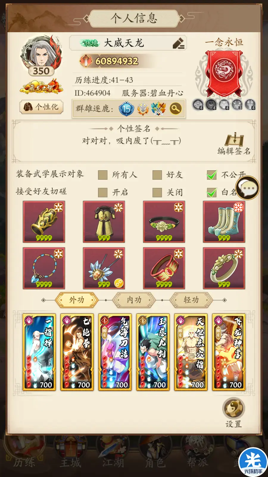 今天爆了37 正好今天开区28天换了义行 水个帖记录一下明天锦衣卫 目前武库点够2w准备丐帮结束换本狼牙 锦衣卫花1万贡献换本飞鱼等歪一本飞鱼开招式。周三无名心法上线,如果没改的话,先觉拉到黄一就不拉了,直接拉清风。目前阵容cEc+WMjh03D82o1Nh92p3hi38q3qaa2U2Ch74K1JB53l4hl13cG73WS96tk63dH29CN24A # # 复制本代码,在游戏中