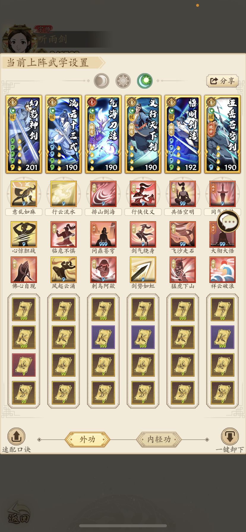 进度为倚天及少林阶段左右,适合双卡玩家的调和剑分享“倒霉”的楼主开服至今没有气海,吾辈当自强,遂发扬纯正剑派。此套配招乃是沉默寡言剑改版,六剑,起手压制,中段爆发,末尾容错,四跨武林胜率 70%+。扛过第一轮,第二波战斗基本就是我们的领域了,我愿称之天外倚天剑,下面对思路进行介绍:首先,最近出的天外飞仙剑无疑补齐了调和剑缺失的大杀器,前期能辅能输出。另一方面,自
