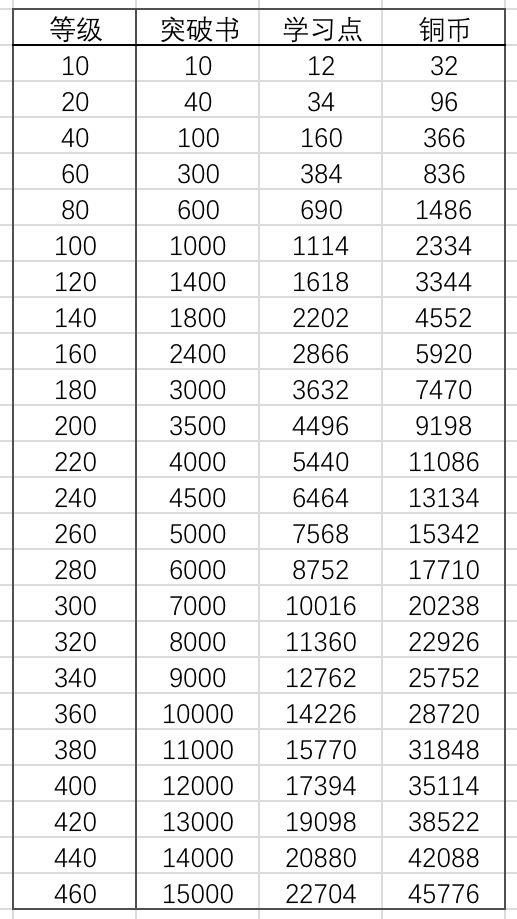 数据:各等级阶段突破材料整合换武学顺便整合了一下,方便朋友们提前准备突破材料。已更新到460级,楼主退游了,有兴趣的大佬可以续更