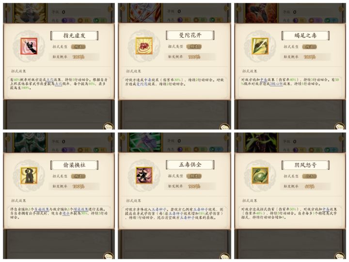 在《无名江湖》游戏的武学招式中,会出现:恢复率、伤害率、流失率等概率。