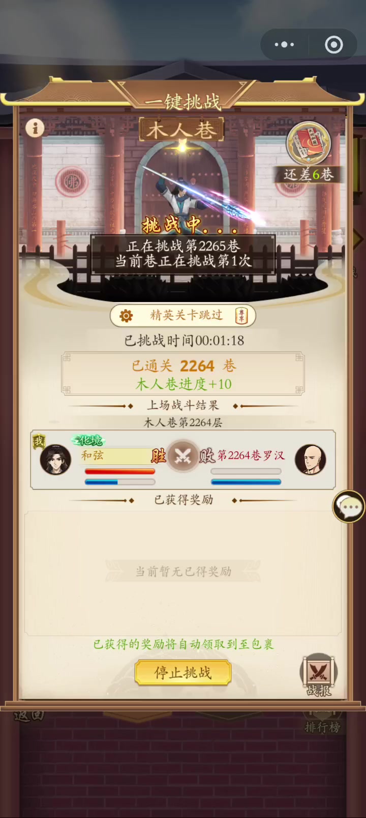 如视频所示,今天微信更新后,木人塔一键挑战,不显示战利品,结算显示错误。回主界面后未见物品增加,十五层塔的资源没有了。玩微信的要小心了