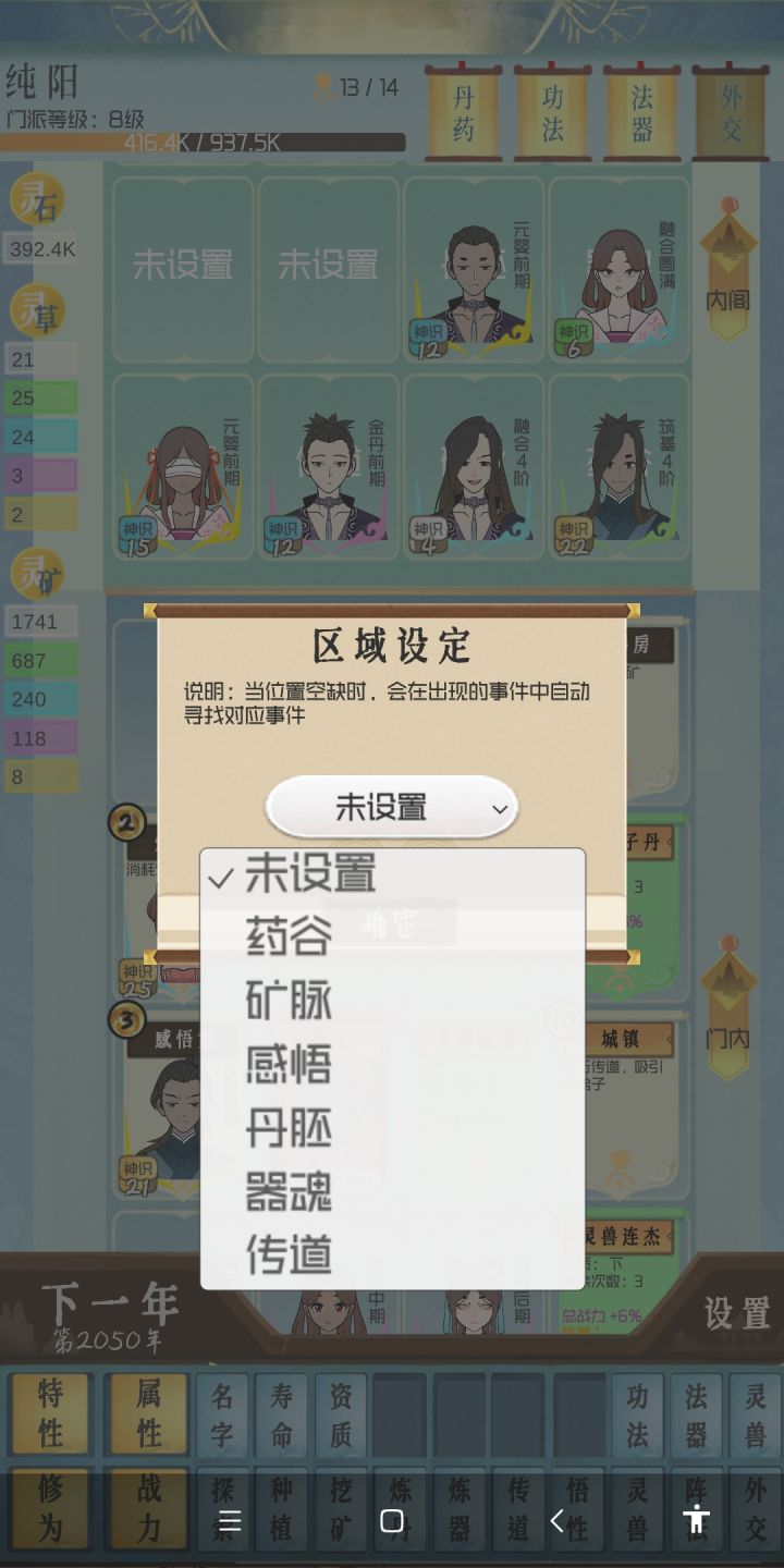 实际上类似于一个自产作坊,你可以在空格中设定吸入的卡片类型(矿脉,药谷等),然后将相应数值高的弟子直接拖在上面,然后就不用管了。