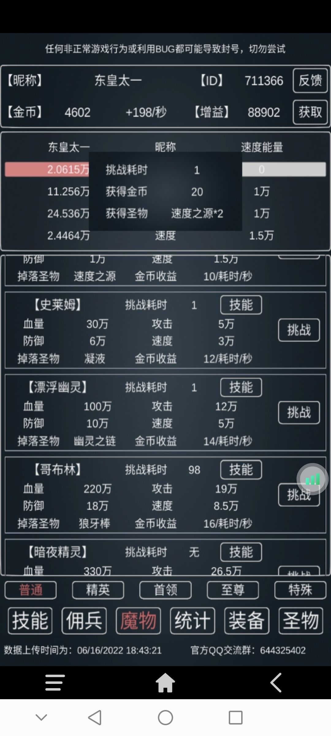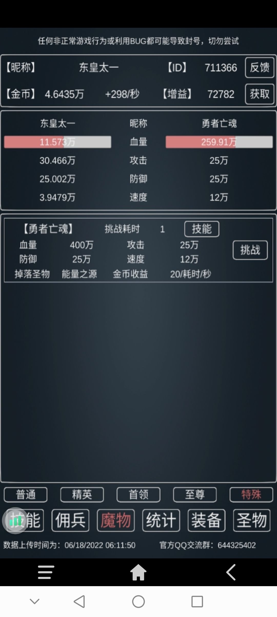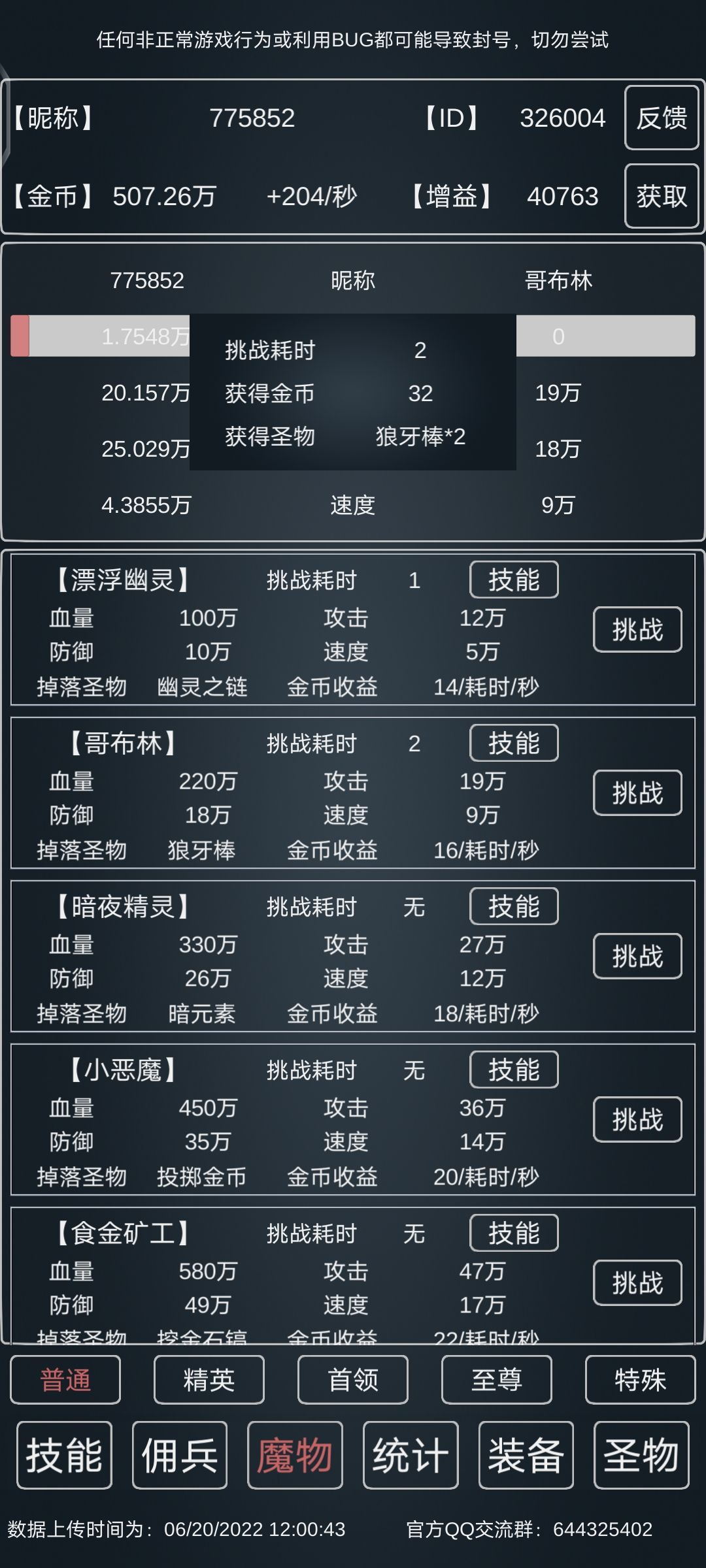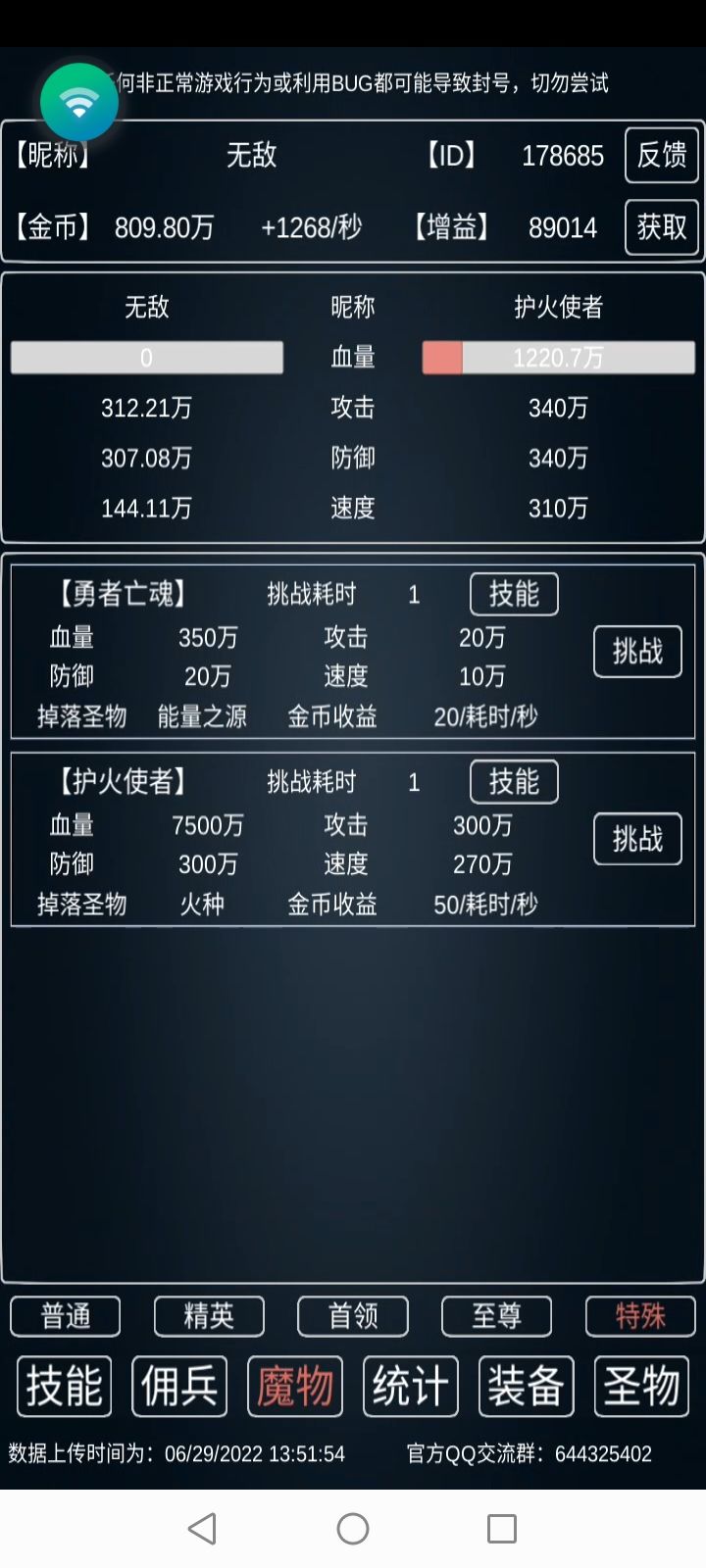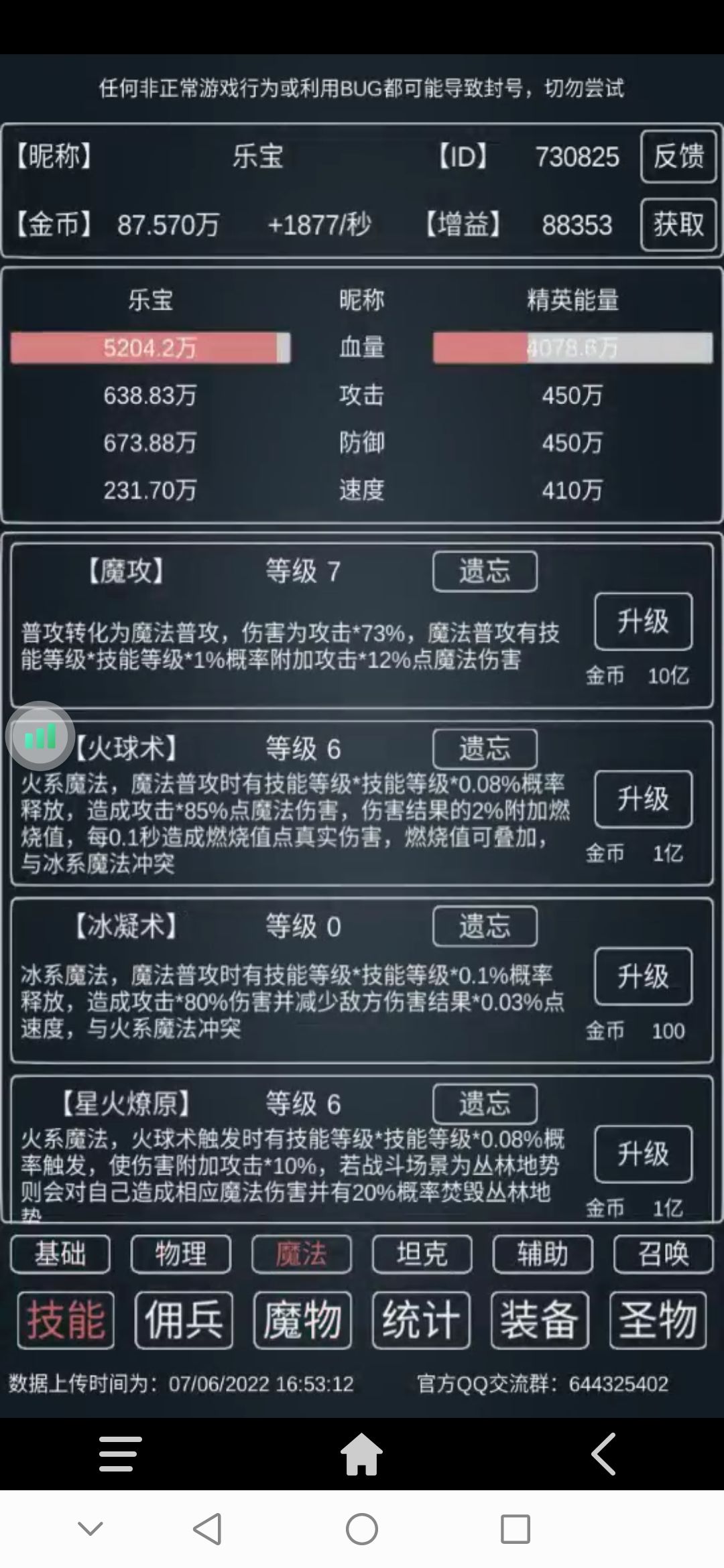 这个版本思路不变,靠赌。 这个怪物思路一开始是借鉴的 手机用户68006530大佬的攻略,魔攻5-6,火球5,召唤各5级,农民35,法师300。武器和护甲10。(上面是引用原文配置,其实法师300和农民35不用点,要么你就300农民补伤害,推荐魔攻6+召唤665剩下补农民)过图属性如下 实测中发现有一些可以优化的地方,一个是法师300级,法师300级的时候基本是不破防的,过图时实测打的伤害只有小几