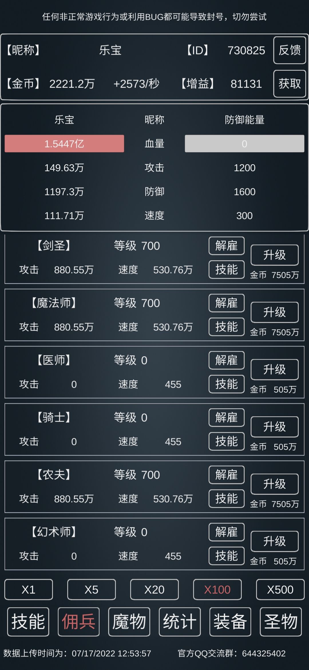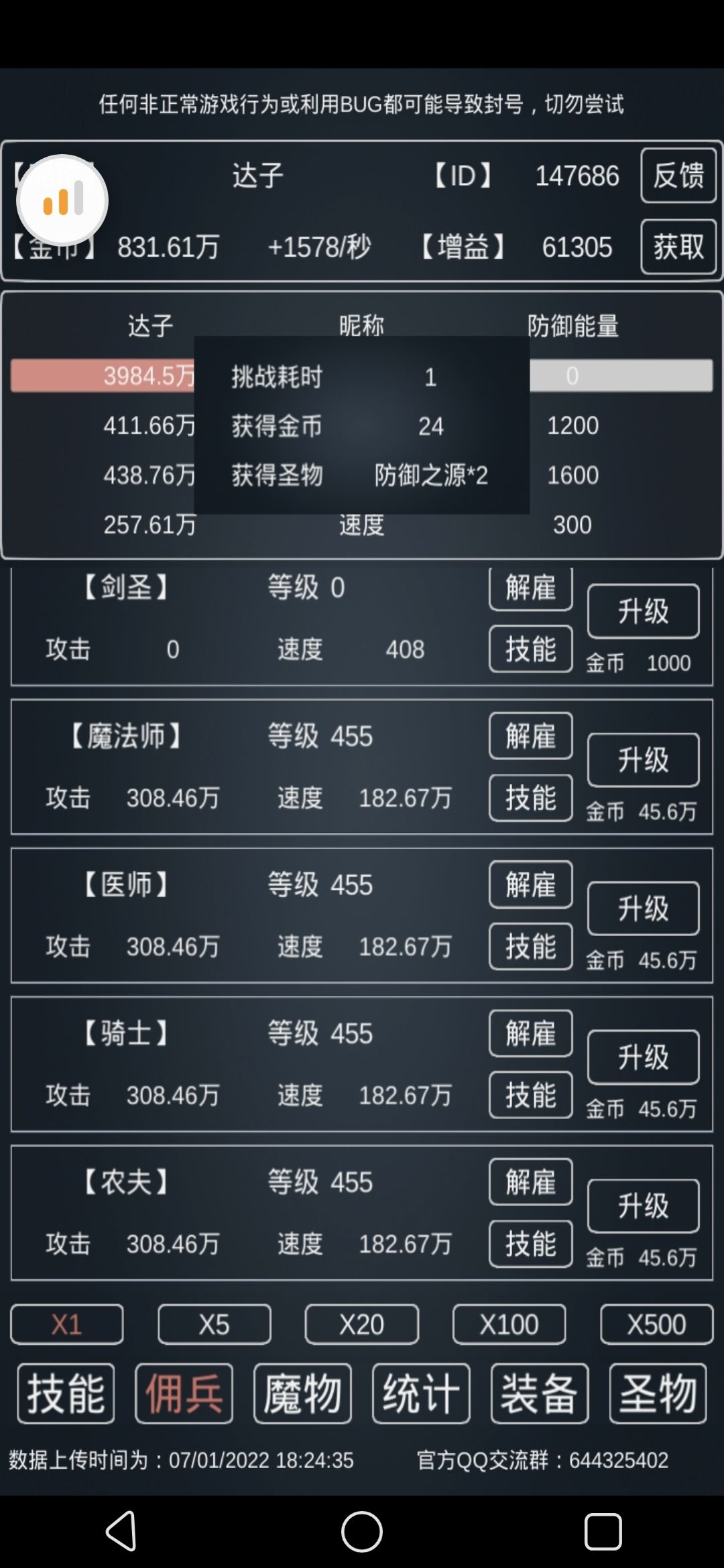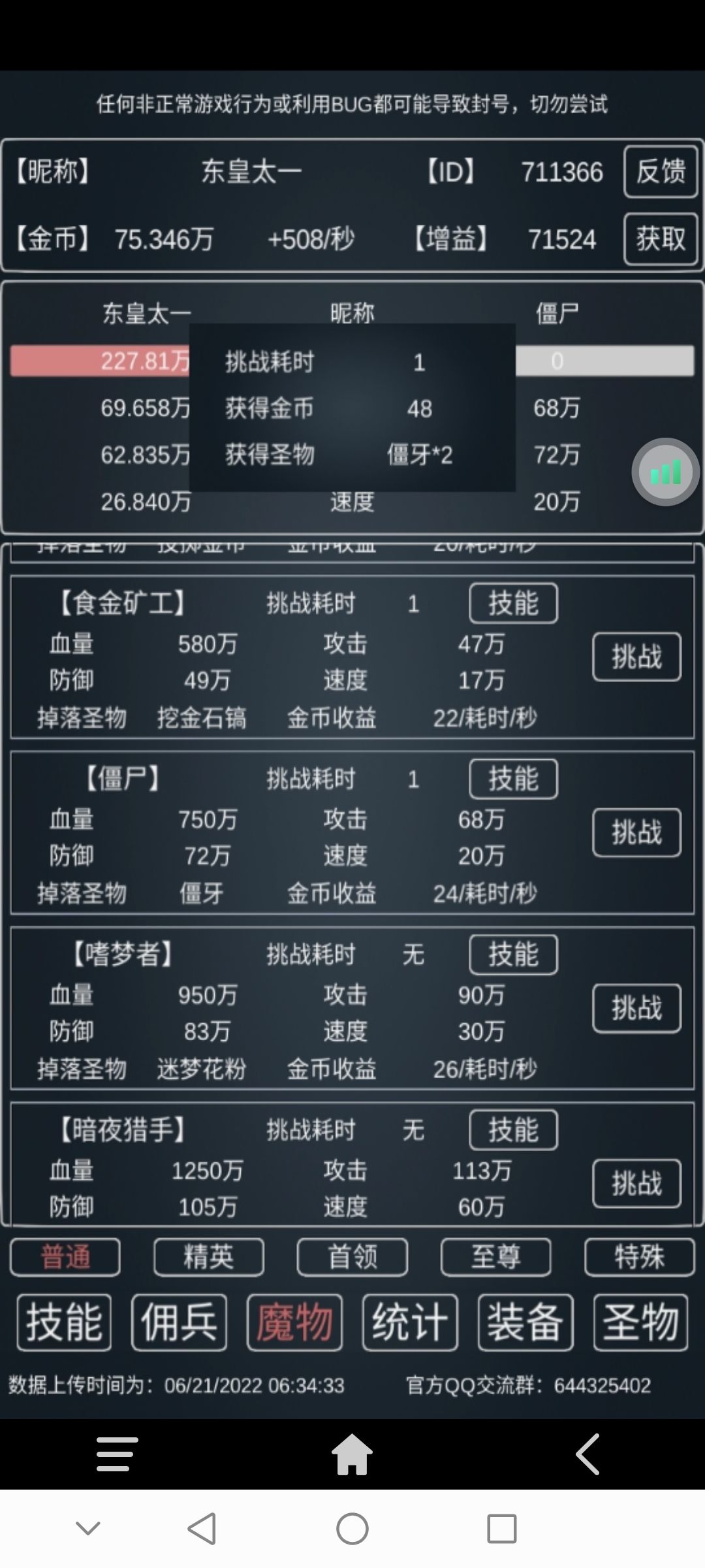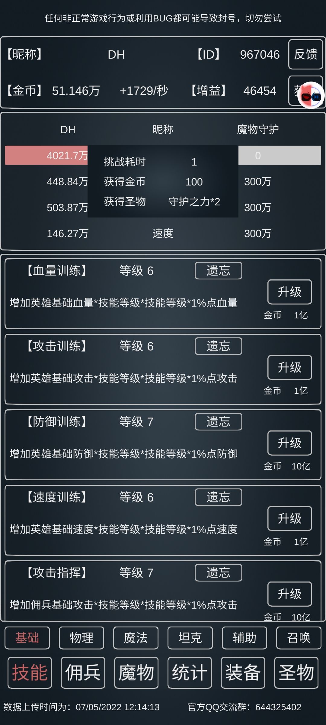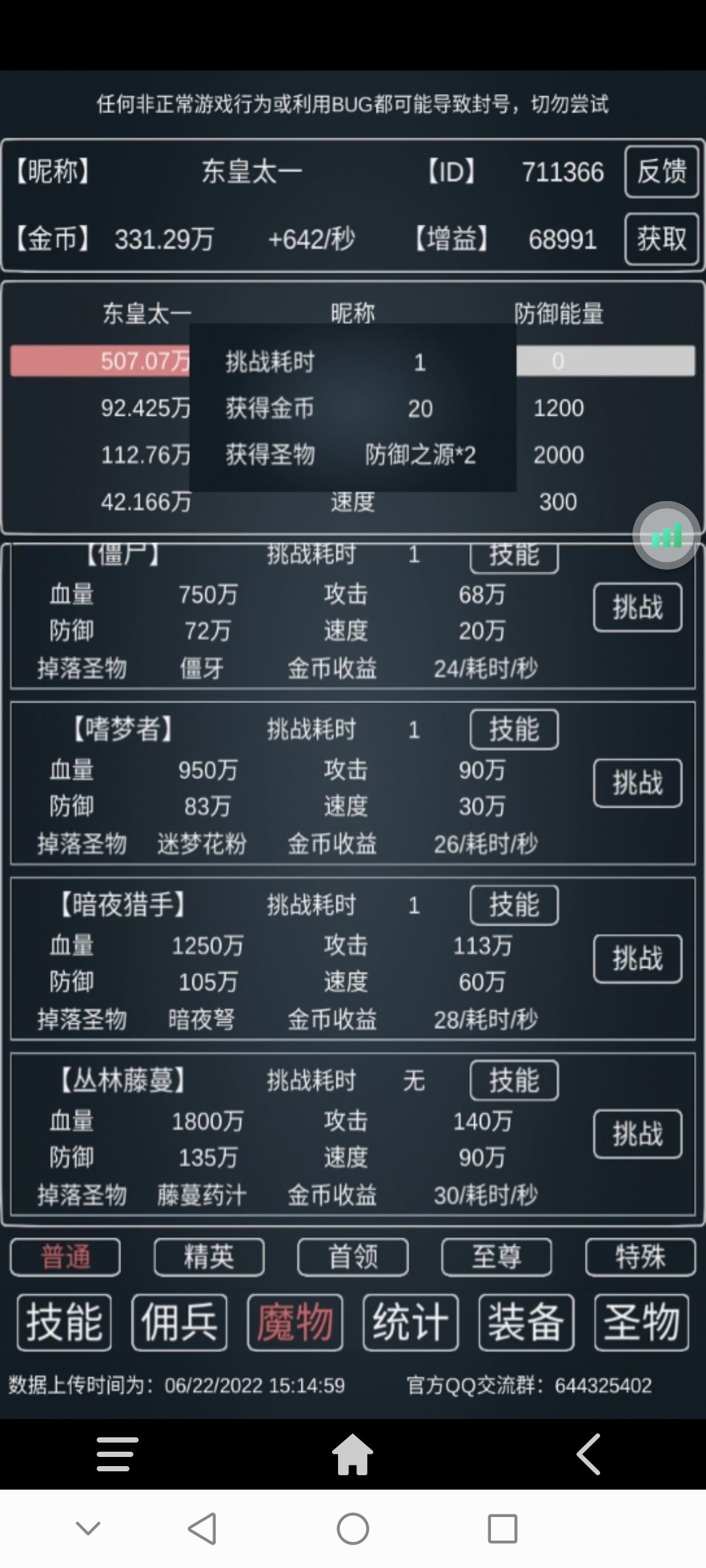 这个版本思路不变,靠赌。 这个怪物思路一开始是借鉴的 手机用户68006530大佬的攻略,魔攻5-6,火球5,召唤各5级,农民35,法师300。武器和护甲10。(上面是引用原文配置,其实法师300和农民35不用点,要么你就300农民补伤害,推荐魔攻6+召唤665剩下补农民)过图属性如下 实测中发现有一些可以优化的地方,一个是法师300级,法师300级的时候基本是不破防的,过图时实测打的伤害只有小几