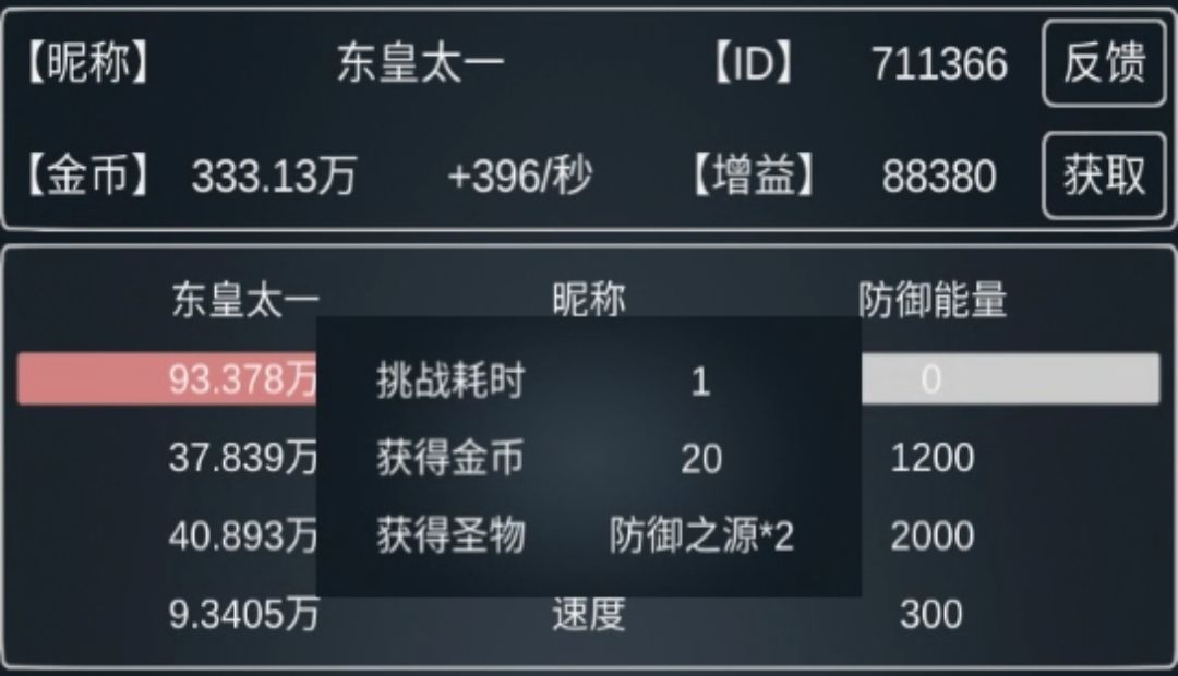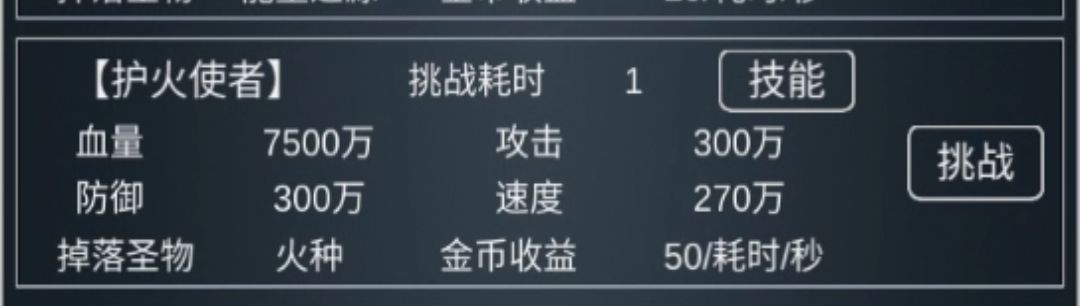 因为火种的特性(吸取你的基础四维),那么我们需要在技能基础与装备上,将防御增加火种的攻击那么多,但是,从各种角度上看,你的攻击只要能够破防,那么时间会随着你破防越多而降低。 或许我们可以刷20w暗夜猎手的圣物加上附带20物理伤害的圣物,赌一下暴击和破甲,或许可以比思路1的火种打你不破防来得更快(因为你刷防御,它也跟着加防御)