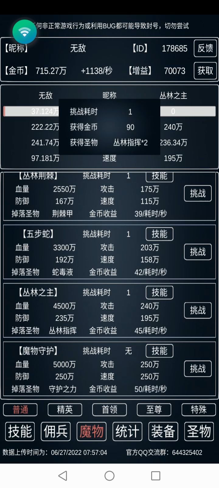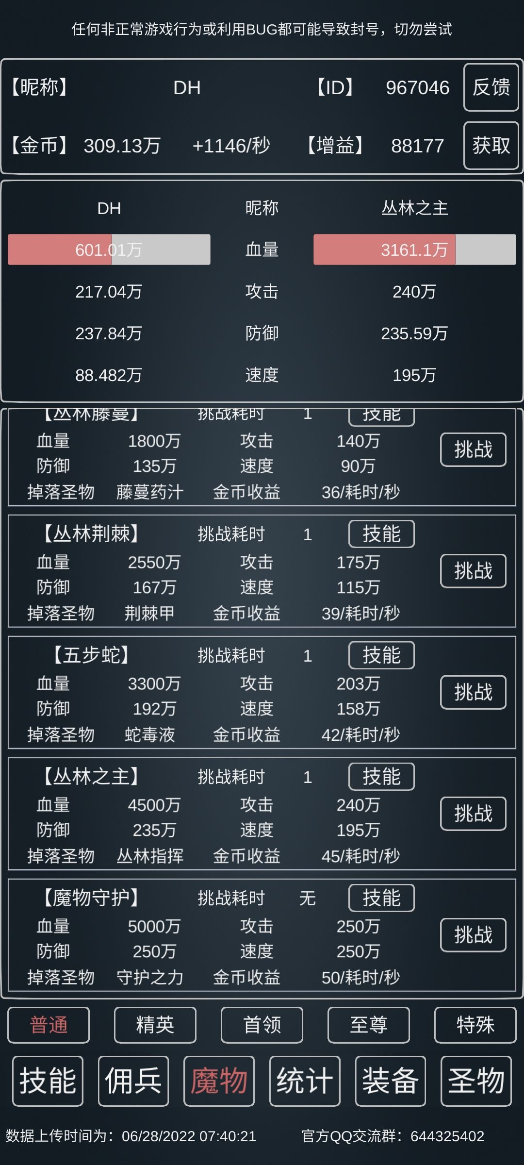 今天早上起来发现四维刷超标了,技能大家发的攻略大同小异,过法差不多,我这个属性进去一次就1s了,完全不用赌,失去了通过这个怪的乐趣,可恶啊 基础:血量训练6 攻击训练7 防御训练7 速度训练6 独狼7 技能:强攻6 疾风斩6 炼体6 装备:武器13 头盔10 护甲10 战靴10 丛林之主没啥太大难度,就是四维达标都能过