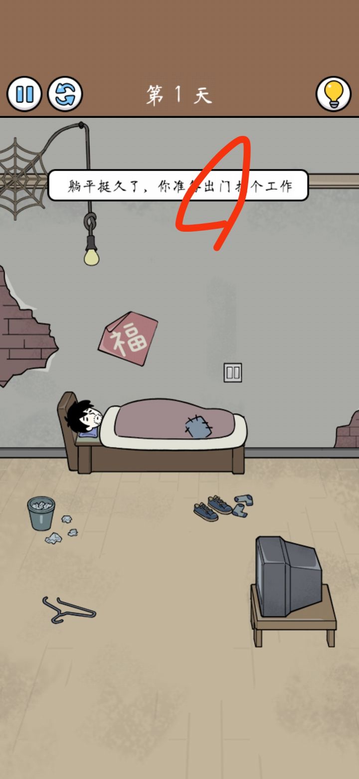 😢有的人看了n个广告过来写攻略了——第一天. 出门工作首先要把上面的“门”字拖到右边出现🚪,然后连床带人拖到门那第二天. 招工把玻璃捡起来刮掉富婆的那张,出现新的招聘广告,点击,然后选最底下那个第三天. 能力测验不用做题,直接关电脑(网管只需要会开关电脑)第四天. 服务业先按照要求的给,直到有人要纸巾去厕所,把那个人的耳机拿开,戴在自己耳上第五天. 下班咯一直点电脑把人赶回去,