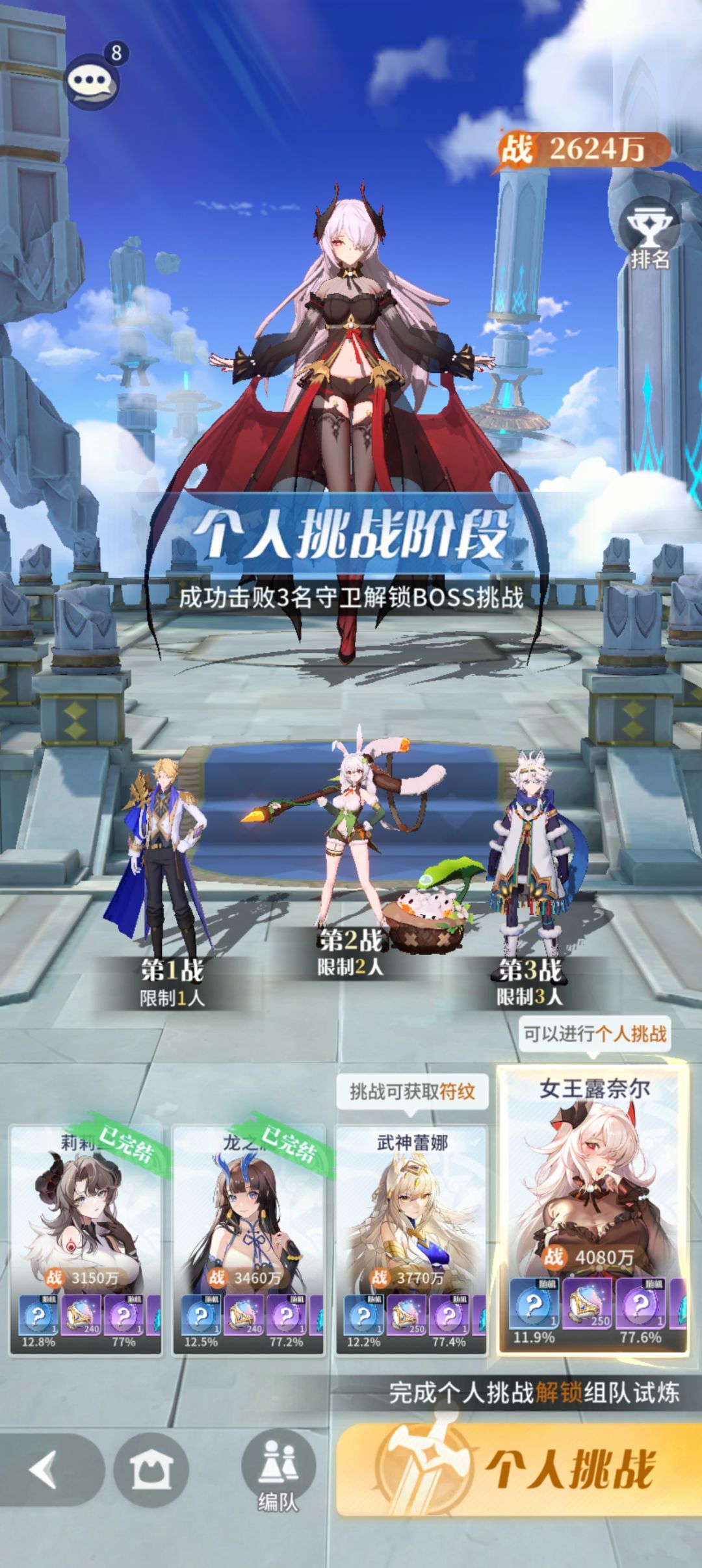 圣堂玩家可以试试我这个阵容打法 1v1:蜜雪儿或者菖蒲符文根据对方是盾还是突击,自己缺伤害还是怕吃大选择暴击或者减能 22:武神+圣棺,要都带暴击符文 33:天极+猎魔人+影盾骑士,天极和骑士前排,守夜人后排。天极抽到就行,UR0。猎魔人和影盾UR1以上越高越好 本人全程越战120w左右解锁,一般都是卡单挑,有余裕的氪佬可以单独养一个单挑卡(神拳或光枪)应对