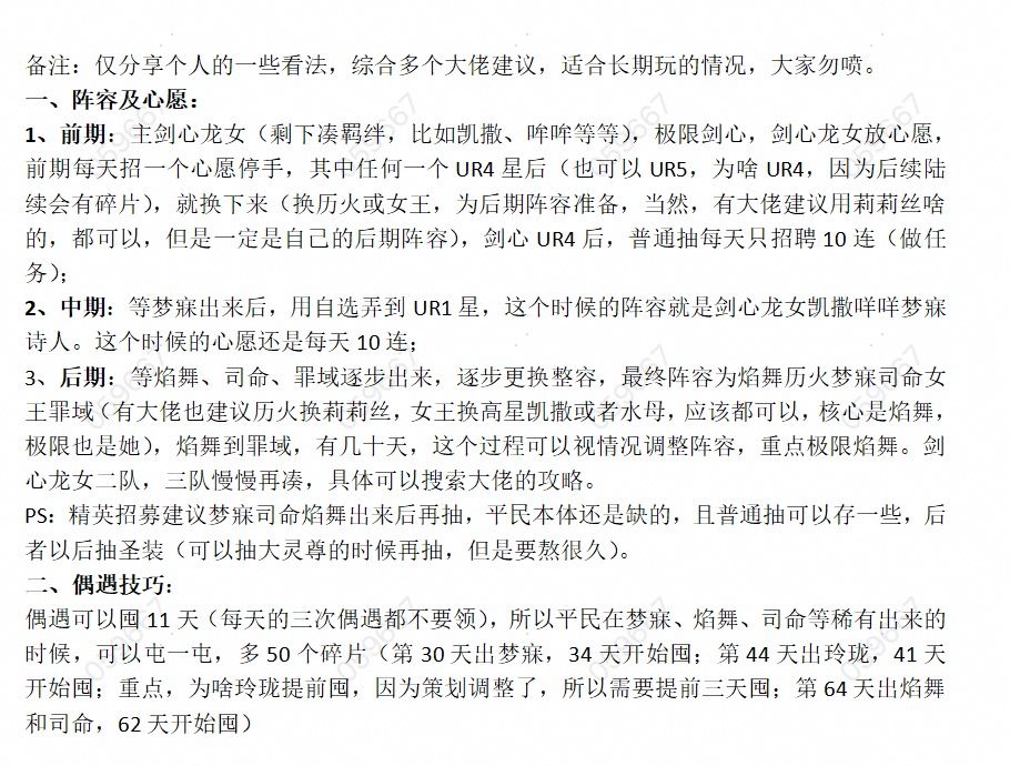 #命运圣契 #命运圣契攻略 我的阵容养歪了,来了太多卡升UR,副队一直没成型,新手玩家只看阵容,别模仿养成 ,以下是养成攻略: 主C:剑心,梦寐,女王,焰舞 副C:莉莉丝,雪儿 辅助:司命,玲珑,圣棺,弥撒 从左到右顺序养成,主C优先全部UR5,副C和辅助UR3均衡培养 突破:不要均衡培养,两个优先突破到梯队10 14 19,剩余四个再后面慢慢追,有体力全部刷两套下次突破的全部材料,再刷