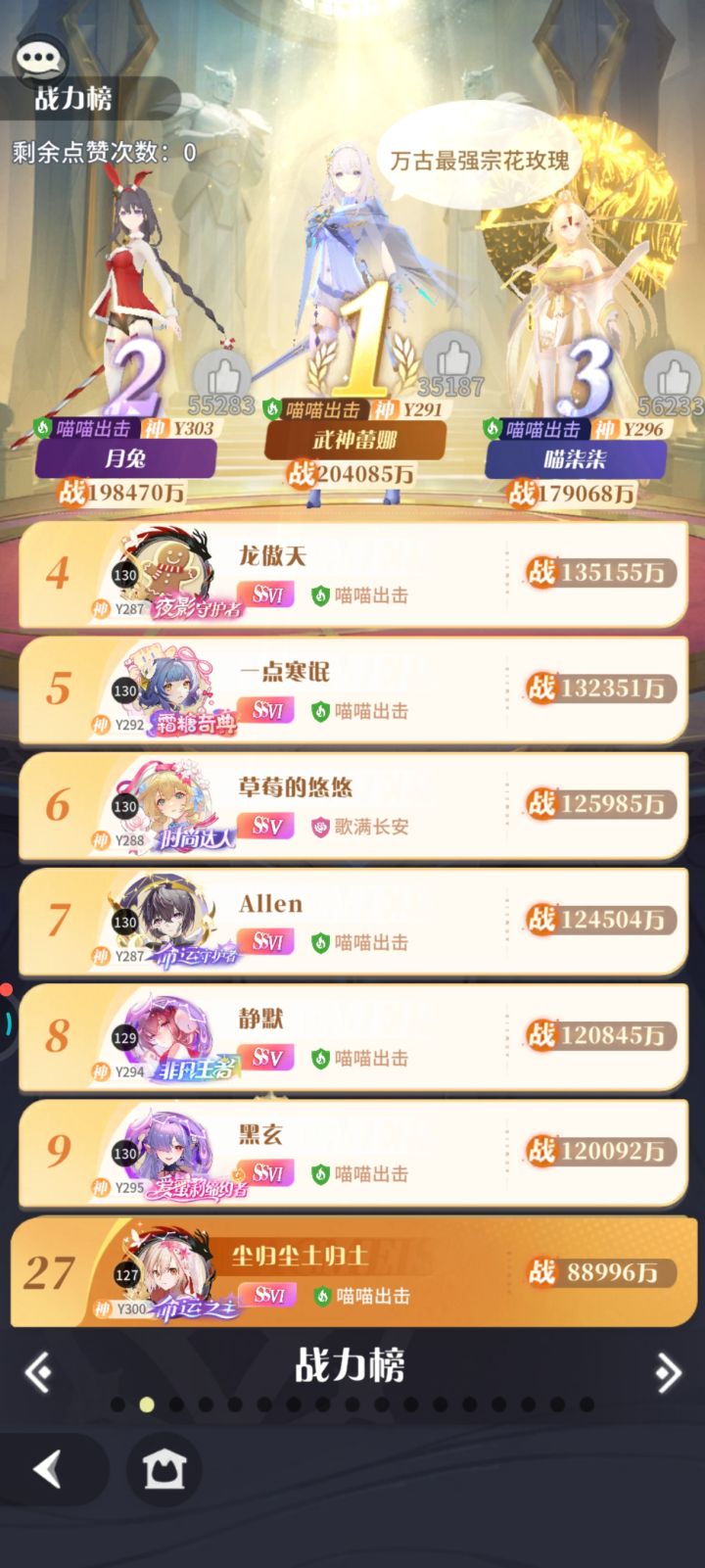 作为喵喵喵喵公会第二任以及现任会长,看着小伙伴们不断的离开游戏,以及命运之夜分成小区为一组后 大家又争取到目前积分第一有感而发,文笔不好想到啥就说啥了,目前老区现状大家都清楚 活动也很匮乏,新鲜感嘛大家早就过了,基本每天收一收菜,慢慢的都会离开,但喵喵喵喵从开区公会,到双子,四极,再到神域,我们并不是一路畅通基本都是前期挨打后面逆风翻盘也可以说就是熬,一直没有散,首先要感谢前任会长