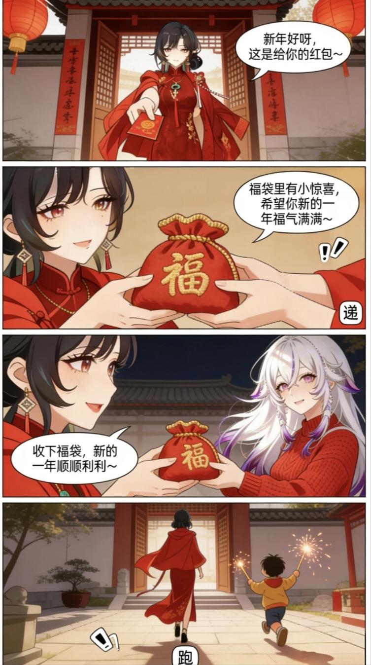 借着本次活动,提前给大家拜个年目前拜年的角色有苏苏、蜜雪儿、夜璃、薇尔公主。大家还想看谁可以在评论区留言。本作品为AI生成的非盈利同人二创,无意冒 犯原作及官方,仅作为观看交流使用。 原作:《命运圣契》(版权归原游戏公司所有) 角色:苏苏,夜璃,蜜雪儿,薇尔类型:AI二创 免责声明:本作品与《命运圣契》官方无关, 不代表官方设定,若涉及侵权请联系本人删 除。 #漫画脑洞共创