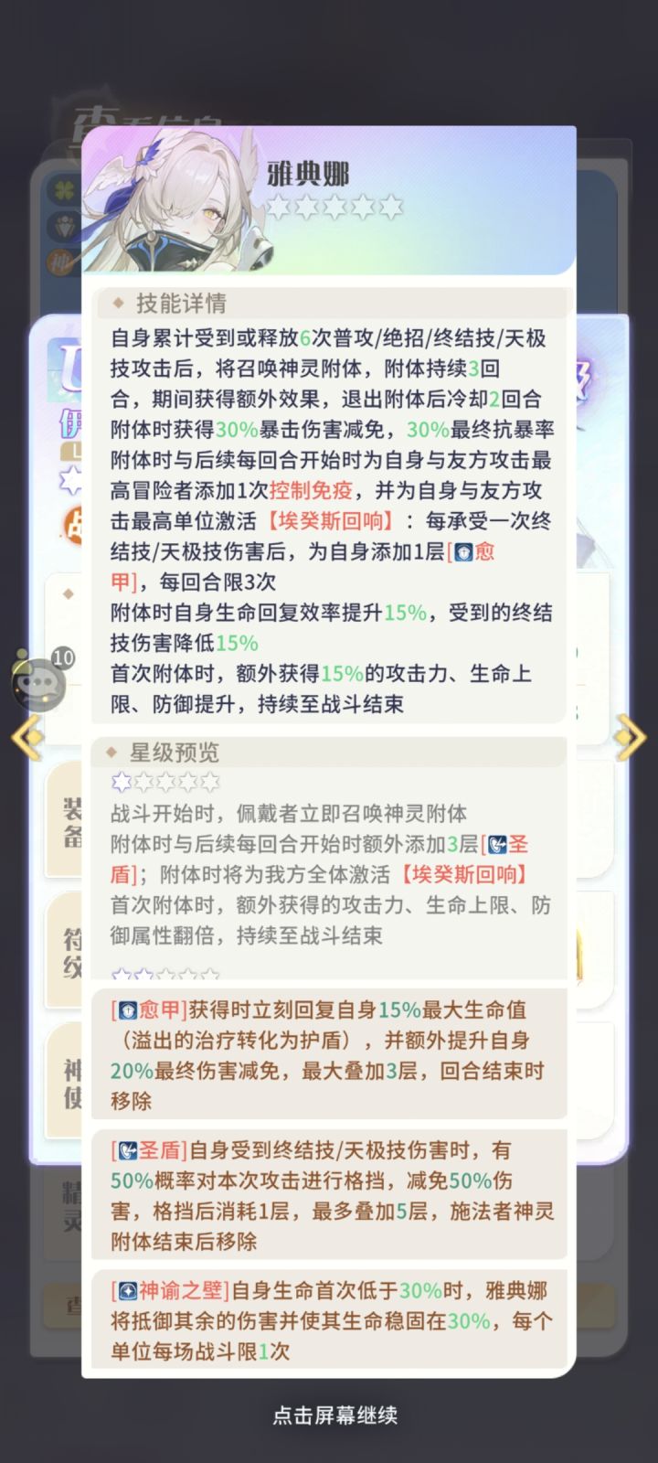 id 4402268,xp+称号+精氪党,#攻略传送门 应征谈谈最新神灵雅典娜,比之前的瓦尔基里,这次技能偏防御型,详情参见图1-3。小氪篇,是指本人首次活动u1/u2,故实测推荐就到这(微氪为拿本体/u1)但这边可简单概括下技能,毕竟现在战斗太复杂,得有人精简重点(1星开始只讲增量):本体附体条件苛刻,需受击6次(角色攻击)附体效果3回合:自身 30%双暴抗(暴击伤害减免和最终抗暴率