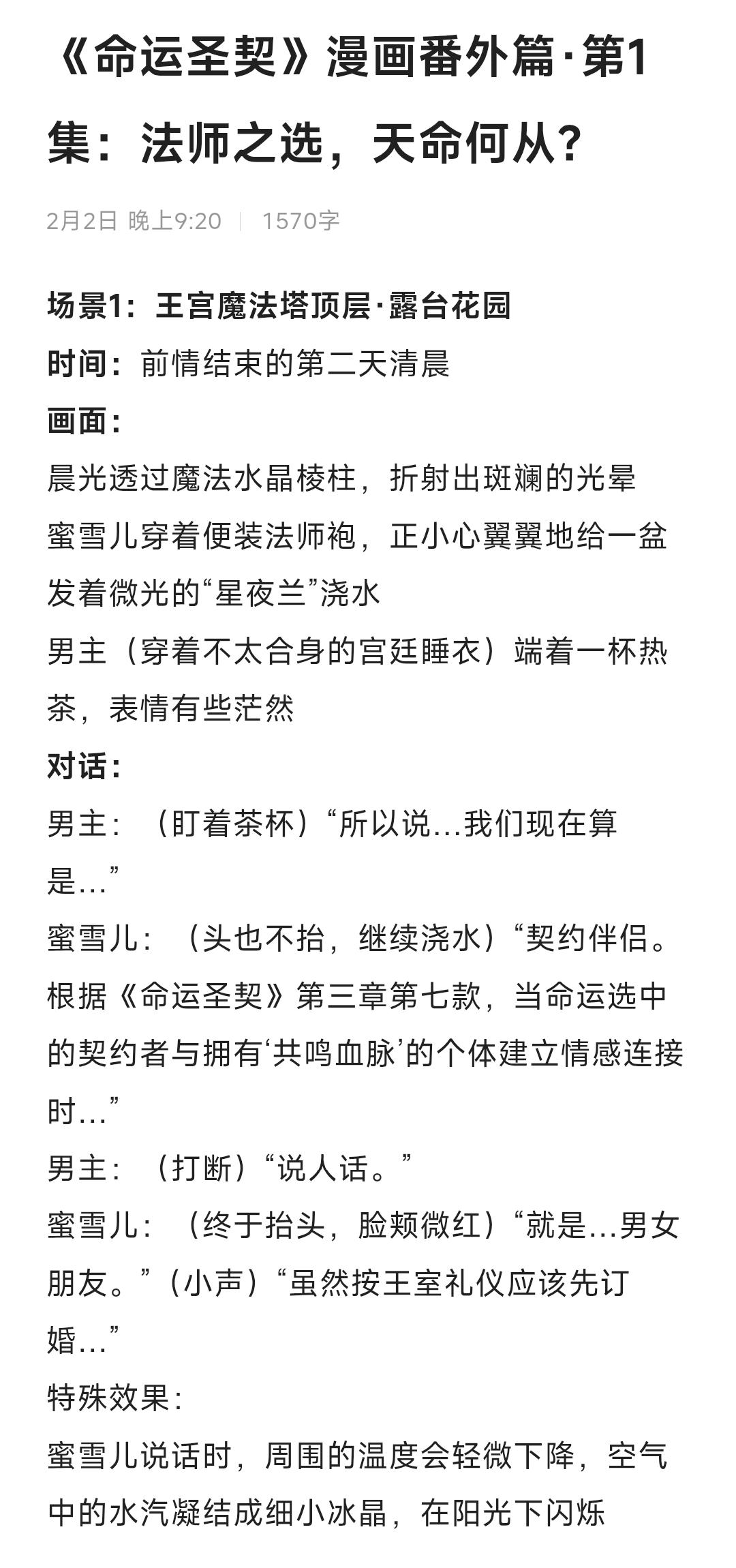 #漫画脑洞共创 《命运圣契》漫画番外篇·第1集:法师之选,天命何从?场景1:王宫魔法塔顶层·露台花园时间:前情结束的第二天清晨画面:晨光透过魔法水晶棱柱,折射出斑斓的光晕蜜雪儿穿着便装法师袍,正小心翼翼地给一盆发着微光的“星夜兰”浇水男主(穿着不太合身的宫廷睡衣)端着一杯热茶,表情有些茫然对话:男主:(盯着茶杯)“所以说…我们现在算是…”蜜雪儿:(头也不抬,继续浇水)“契约伴侣