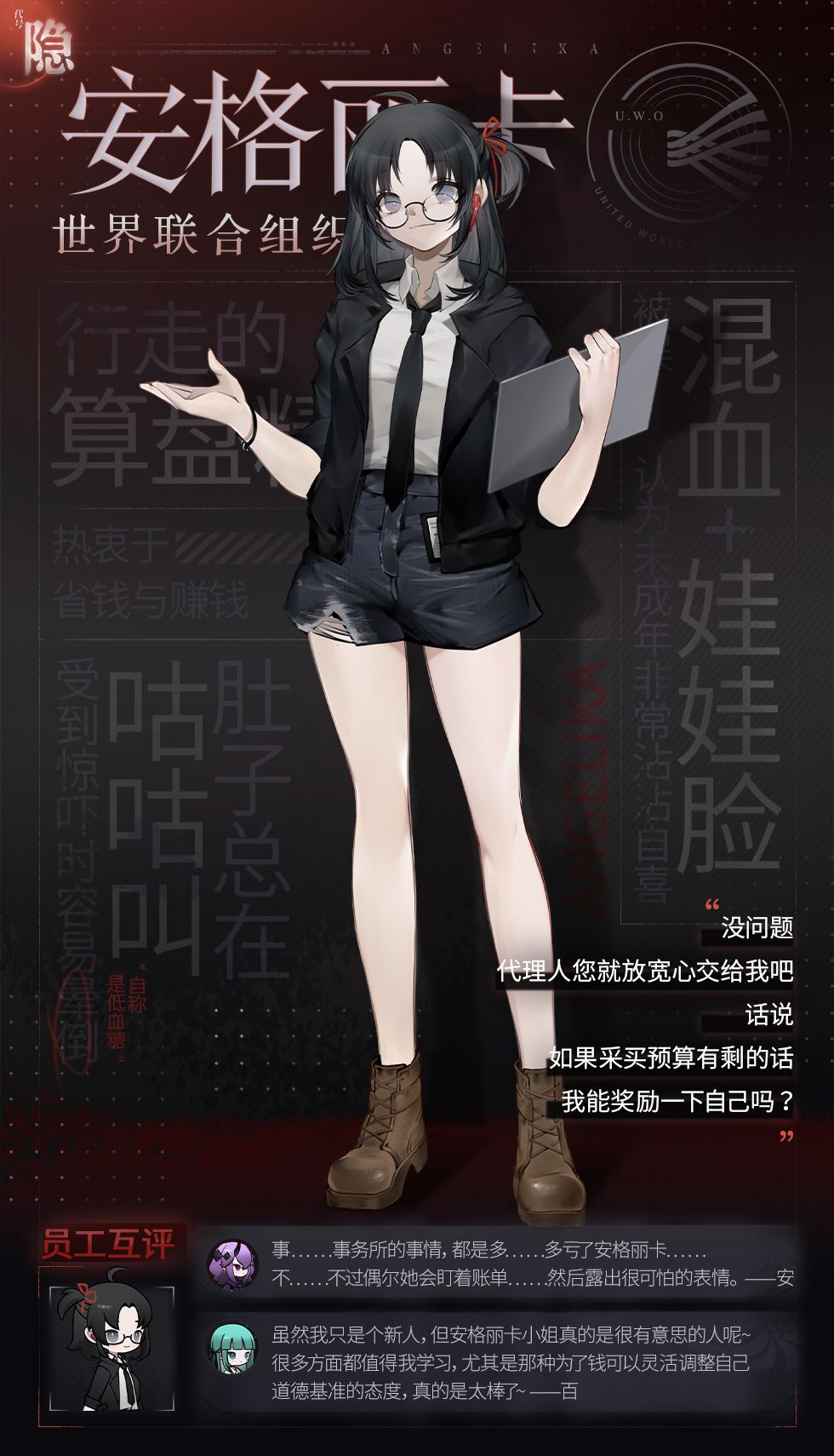 【代理人专属引导员】 ■■■ 安格丽卡 | Angelika ■■■ ■所属势力:世界联合组织 ■性格:开朗、稍微有些一惊一乍 ■兴趣:打折便当、收纳 ■讨厌:乌冬面 「 没问题,代理人您就放宽心交给我吧。话说,如果采买预算有剩的话我能奖励一下自己吗?」 混血穗秋人,导师的助手,被导师指派给了主角。个性开朗,感情丰富,很会照顾人,也适合后勤和情报管理,随身物品里除了报告、平板终端,还有许多移动终端