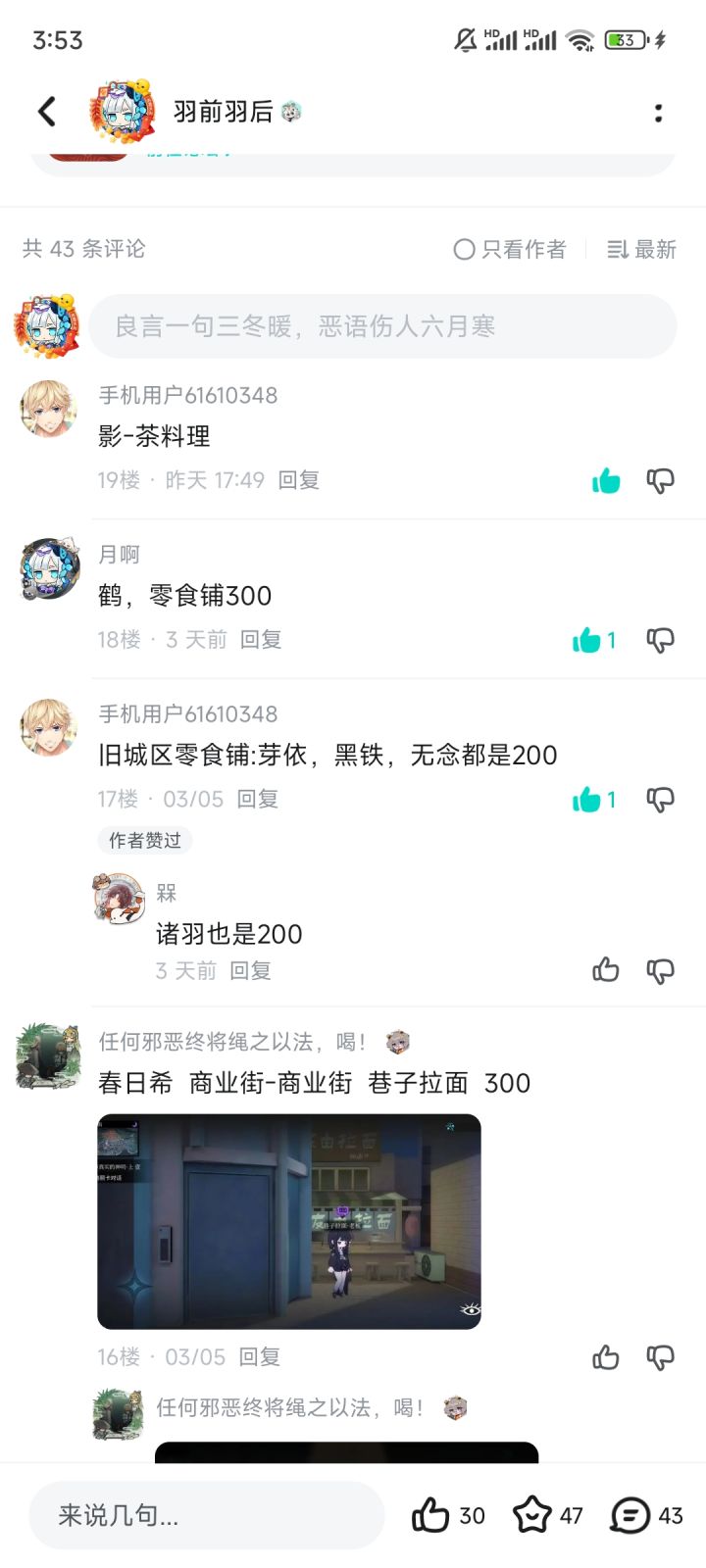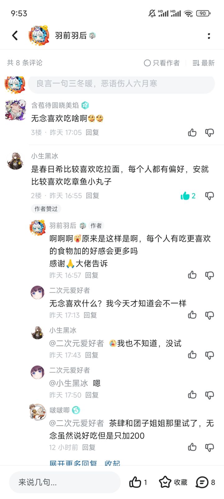 春日希——(商业街)巷子拉面🍜 (旧城区大食堂)牛肉饭🍚安——章鱼烧🐙泊舟——茶🍵料理葵——茶🍵料理, 灵泉水龙山——团子🍡楠先生——(流放之街)极道拉面🍜勘解由蕾 ——极道拉面🍜鹤——零食铺🍰影——茶料理🍵环——极道拉面🍜 无念吃啥都是200好感,上面☝️的料理无念都吃过了另外料理店开的时间每天都不一样,只在规定时间开,其他时间打样星期一:集市的章鱼烧🐙商业街的巷子拉