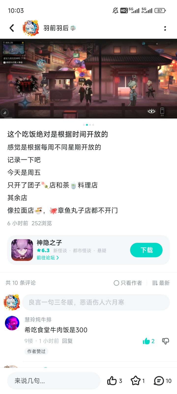 #神隐之子攻略 台服角色全图鉴老登,国服大改后的三次测试都有参加,国服昨天就打通噩梦肉鸽了,深渊也11级了,本贴主要是盘点国服要注意的细节和小知识,避免萌新走弯路1.第一周一定要买一点体力和资源赶进度,因为深渊首通奖励是每周刷新的,一定要赶一下进度。2.日常探索,每日任务做完有七点行动力,可以单独吃饭两次补40体、神社一次双倍掉落buff、乐屋委托一次,剩下的请老婆吃饭加好感,地图中的宝箱有隐