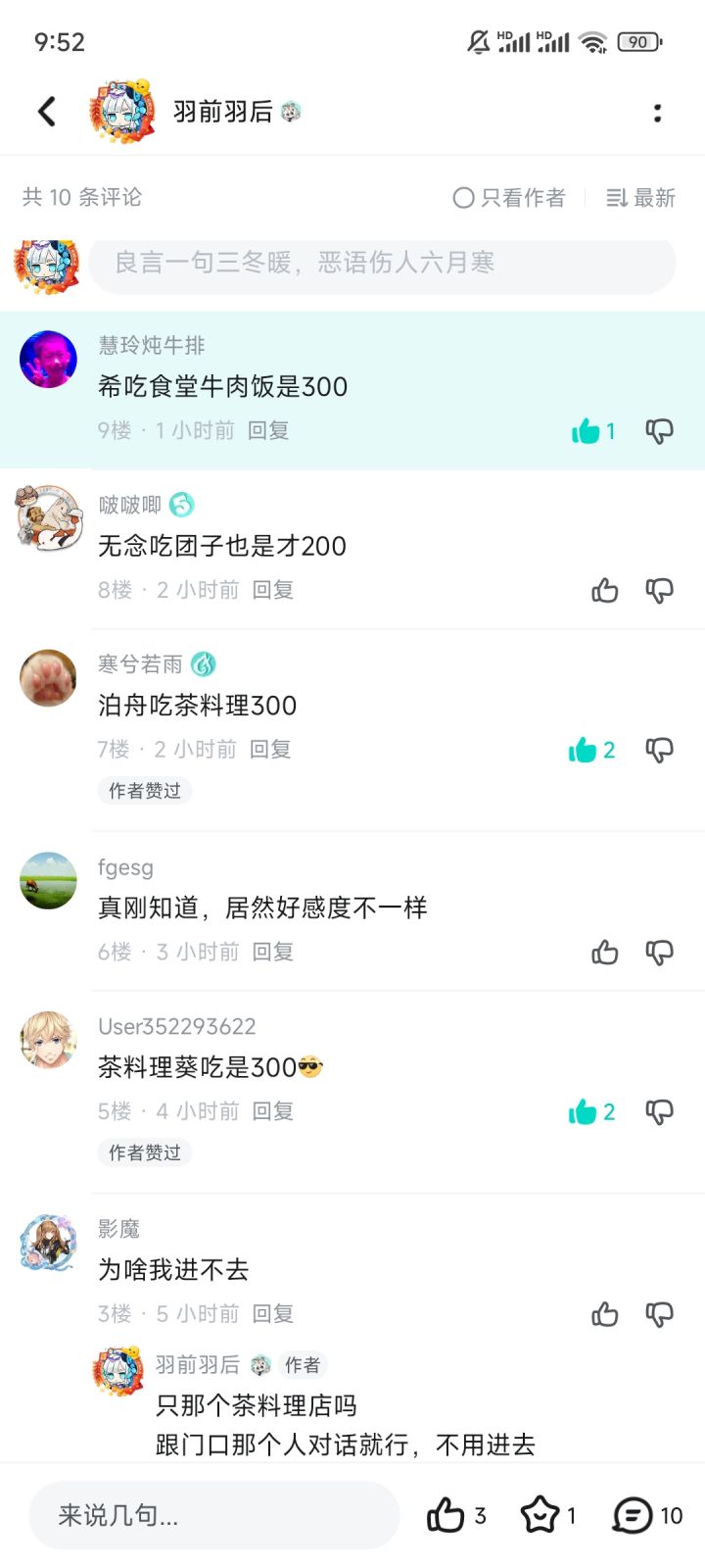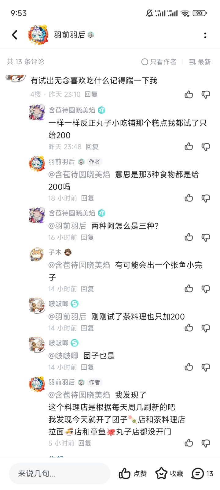 春日希——(商业街)巷子拉面🍜 (旧城区大食堂)牛肉饭🍚安——章鱼烧🐙泊舟——茶🍵料理葵——茶🍵料理, 灵泉水龙山——团子🍡楠先生——(流放之街)极道拉面🍜勘解由蕾 ——极道拉面🍜鹤——零食铺🍰影——茶料理🍵环——极道拉面🍜 无念吃啥都是200好感,上面☝️的料理无念都吃过了另外料理店开的时间每天都不一样,只在规定时间开,其他时间打样星期一:集市的章鱼烧🐙商业街的巷子拉