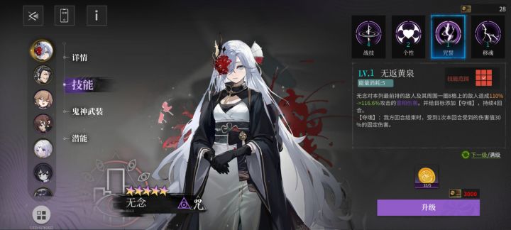 #神隐之子攻略 雷系安输出型,被动慢热双爆,咒誓再动击杀刷新定位为小怪收割型单体c,作为赠送角色并且签到可获得碎片,安的强度无疑是ok的,无论是爬塔还是打部分boss清小怪都有一定用处。但是其咒誓机制注定了她会消耗大量能量点,换言之她更适合水队而非雷队评分:7无念辅助型,三大debuff使任何队伍带上她都稳赚不亏,咒誓的夺魂使目标九宫格回合结束时受到本回合受到30/50%的固定伤害