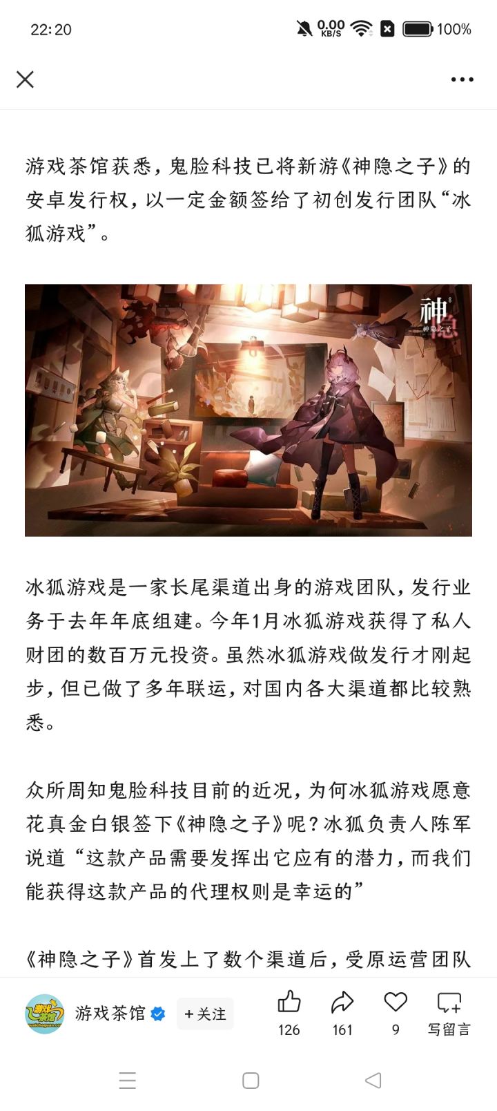 要换运营了。鬼脸科技已将新游《神隐之子》的安卓发行权,以一定金额签给了初创发行团队“冰狐游戏”。冰狐游戏是一家长尾渠道出身的游戏团队,发行业务于去年年底组建。今年1月冰狐游戏获得了私人财团的数百万元投资。虽然冰狐游戏做发行才刚起步,但已做了多年联运,对国内各大渠道都比较熟悉。众所周知鬼脸科技目前的近况,为何冰狐游戏愿意花真金白银签下《神隐之子》呢?冰狐负责人陈军说道 “这款产品需要发挥出它应