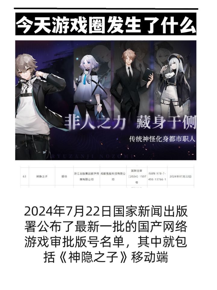 #今天游戏圈发生了啥 #代号隐 🍵2024年7月22日国家新闻出版署公布了最新一批的国产网络游戏审批版号名单,其中就包括《神隐之子》移动端。🕊️不过不是很好看这款游戏,灵异怪谈这个赛道人多就算了,还打不过别的游戏,比如《新月同行》,上个月拿到版号的《黄金四目》,还有《归龙潮》、《野火流明》……