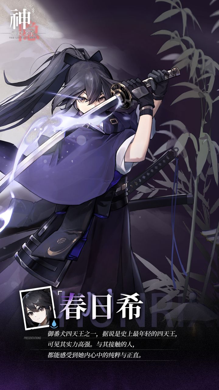 【神觉者契约书-春日希】■■■ 春日希 | Kasuga Nozomi ■■■■关键词一:“追求武道即为本心。”>>> 寻道求索,心无旁骛。■关键词二:“作为神子的刃,在下绝不退让半步!”>>> 守护神子的意志无人能及。■关键词三:“别、别废话了,快、快回答吧!”>>>即便偶有苦恼,但亦是率直的真心。御番犬四天王之一,据说是史上最年轻的四天王,可见其实力高强。与其接触的人,都能感受
